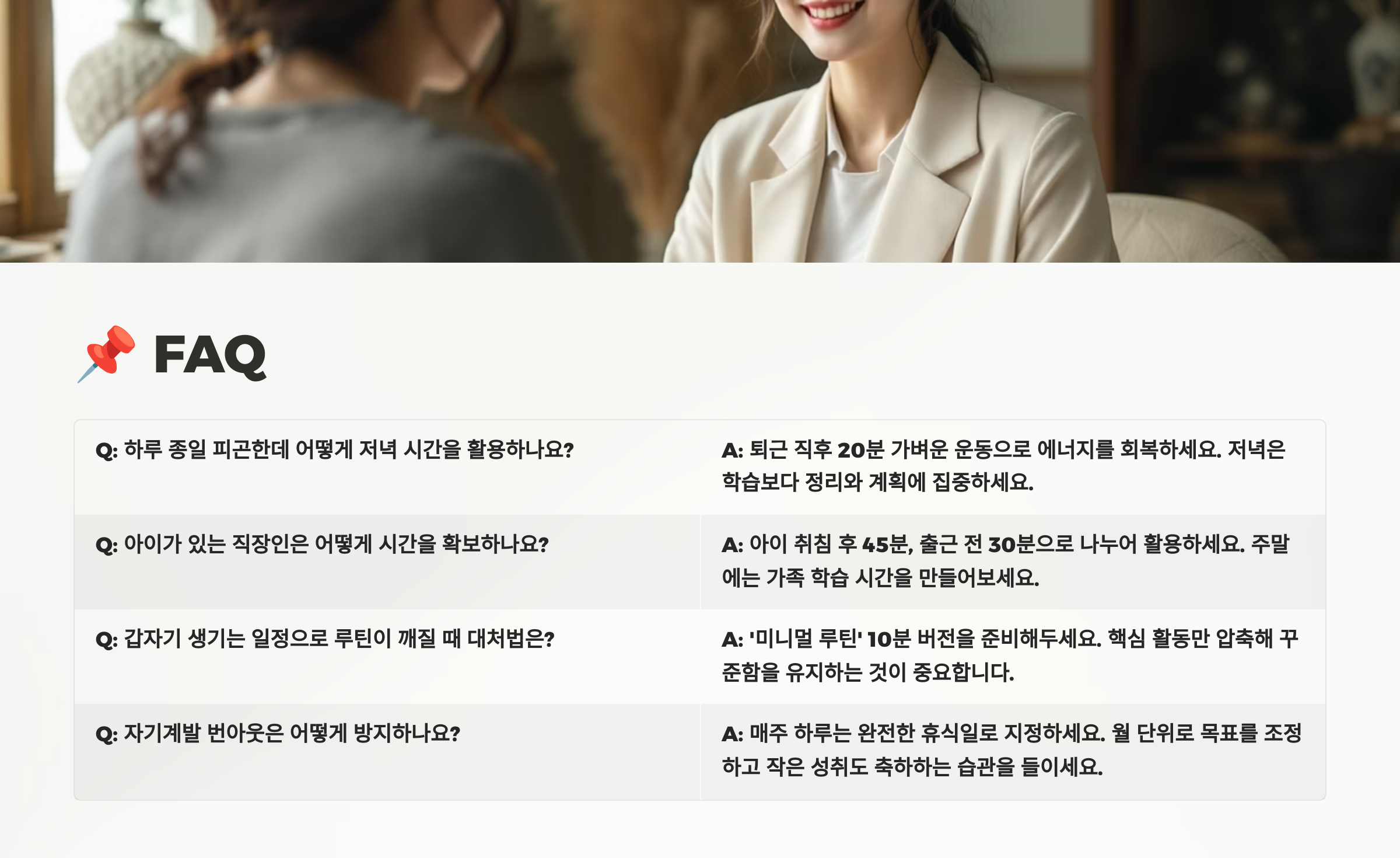 다음은 📌 FAQ입니다. 자기계발을 실천하면서 자주 받는 질문 8가지를 모아 답변과 함께 정리해드릴게요!