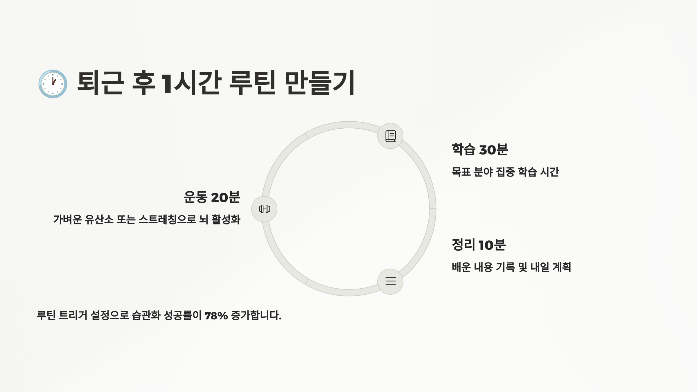 퇴근 후 시간이 생기면, “좀 쉬다가…” 하고 소파에 앉았다가 눈 떠보면 밤 11시인 경우 많죠? 🙈 그래서 정해진 루틴이 없다면 뇌는 자동으로 쉬는 방향으로 흘러가요. 이럴 땐 하루 중 단 1시간이라도 자동화된 루틴으로 굳히는 게 핵심이에요!