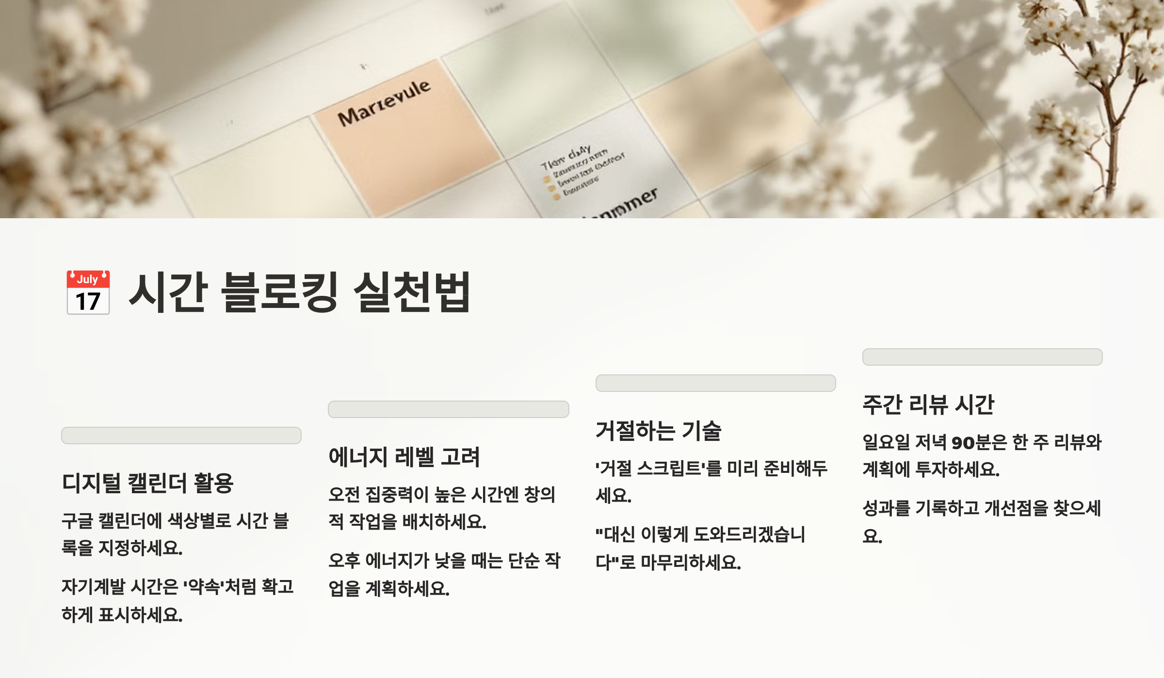 중요한 건 “시간 나면 하자”가 아니라 “시간을 만들어서 넣는다”는 사고방식이에요. 내 시간표에 자기계발을 예약하지 않으면, 아무 일도 일어나지 않아요. 블로킹은 그 예약을 시작하는 최고의 습관이랍니다! ✅