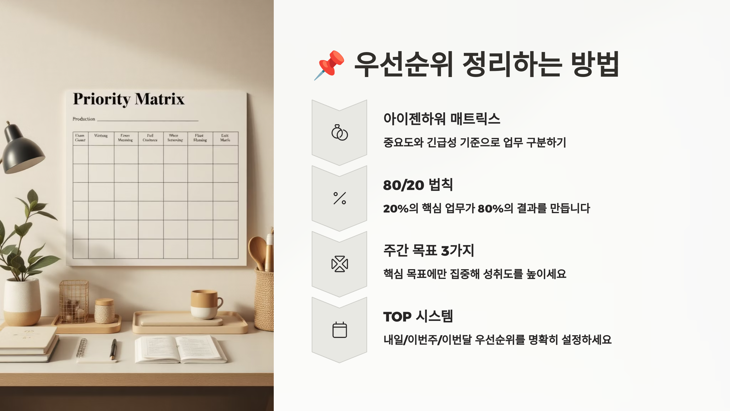 “중요한 일 먼저”라는 원칙은 단순하지만 강력해요. 결국 실천의 차이가 나를 성장하게 만들어요! 💪