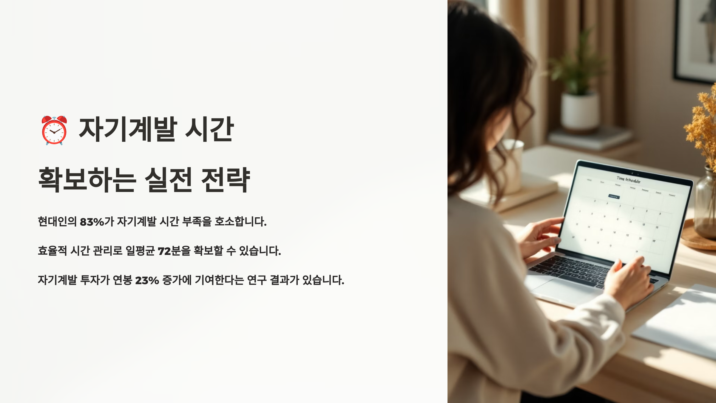 자기계발은 ‘시간이 많아서 하는 것’이 아니라, 시간이 부족한 와중에도 조금씩 나를 챙기는 선택에서 시작돼요. 퇴근 후 1시간, 주말 오전 30분, 출퇴근 중 15분… 그 시간들이 쌓이면 나도 모르게 더 나은 나로 성장해 있어요. 🚀