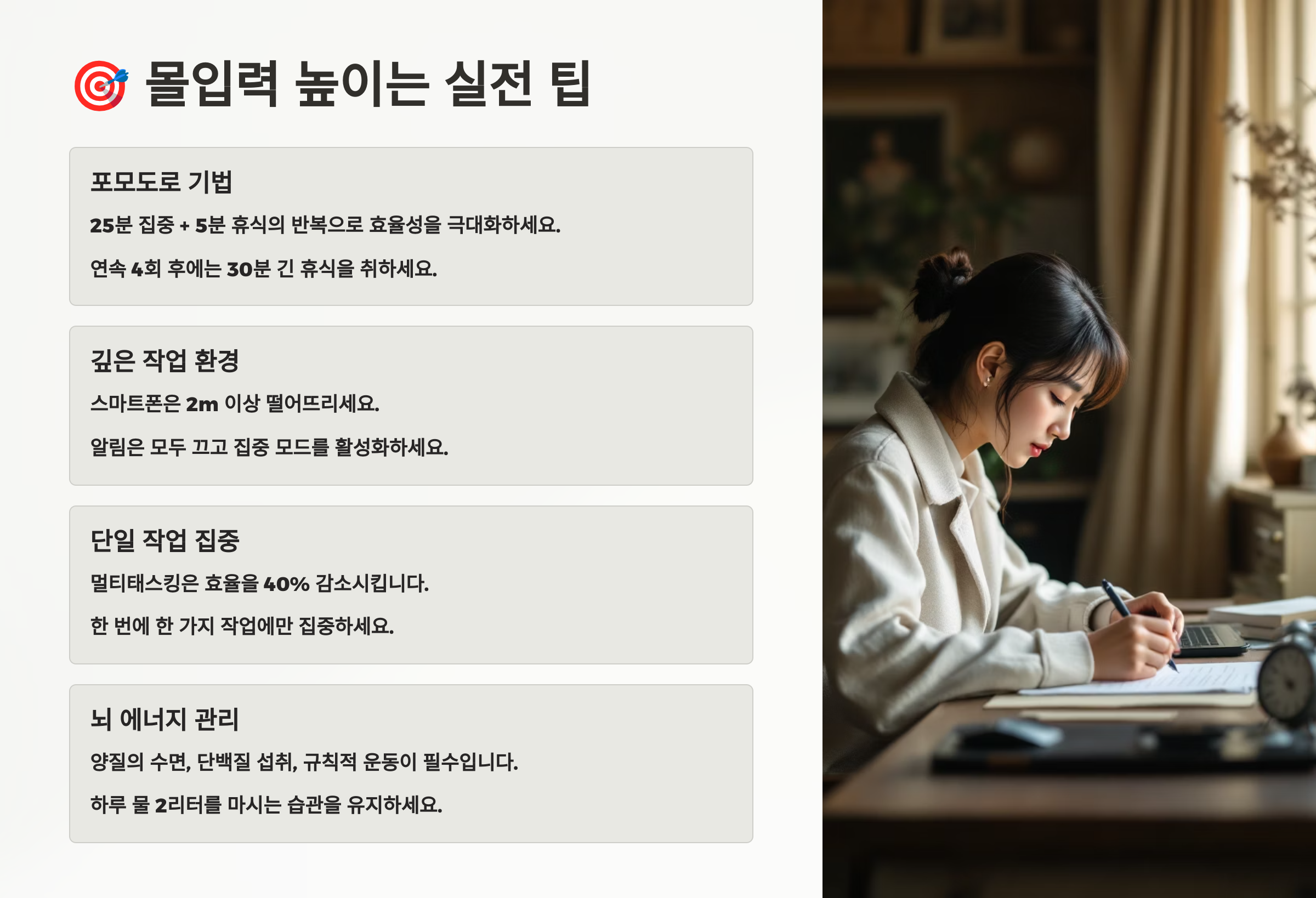 다음은 🎯 몰입력 높이는 실전 팁이에요. 아무리 시간이 있어도 집중하지 못하면 성과도 없죠. 몰입을 유도하는 실전 전략들을 정리해드릴게요!