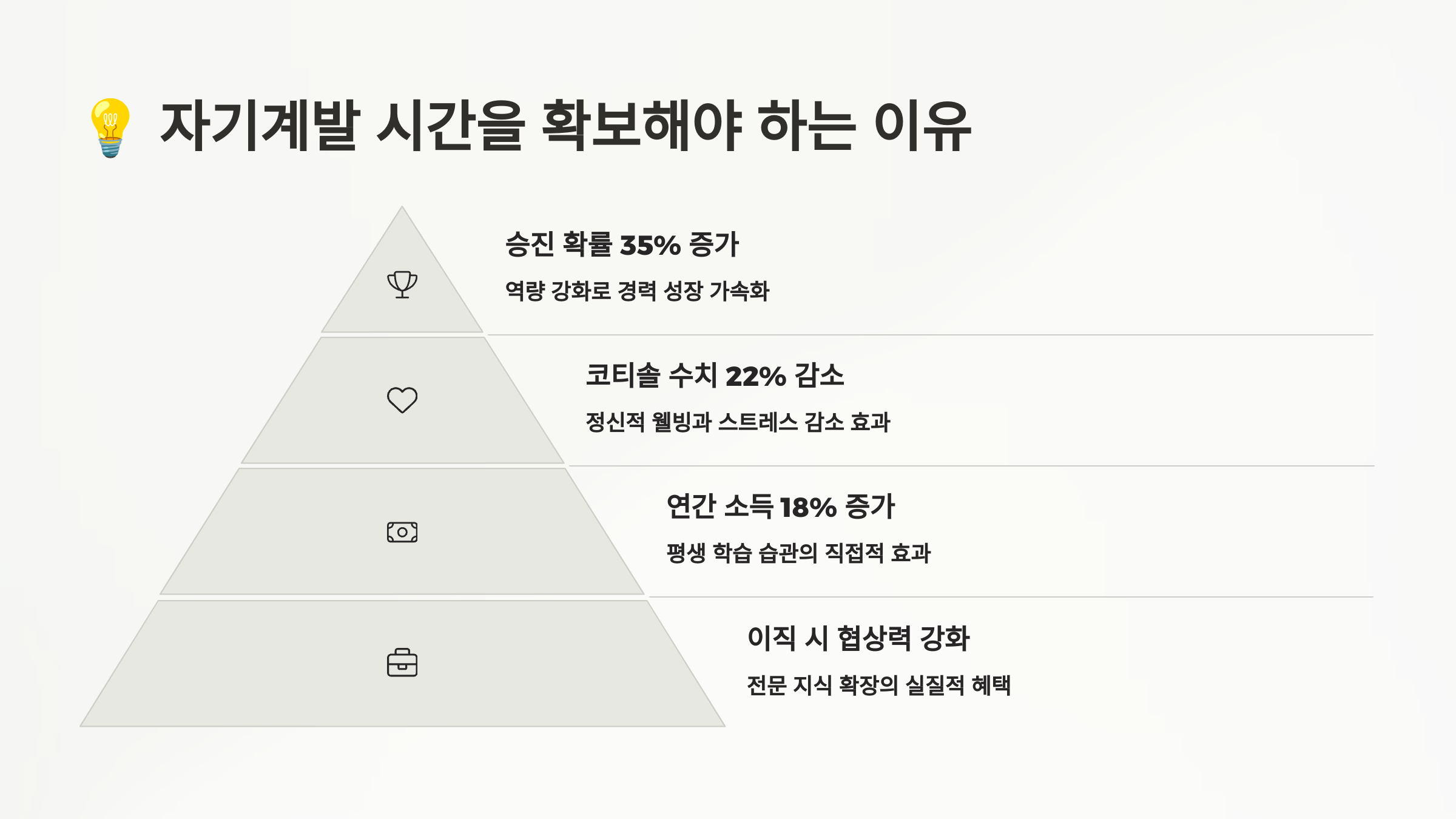자기계발을 하고 싶은 마음은 있지만, 막상 퇴근하고 나면 시간도 에너지도 바닥일 때가 많죠. 그렇다고 “바쁘니까 나중에…” 하고 미루다 보면 결국 1년, 3년이 순식간에 지나가 버려요. ⏳