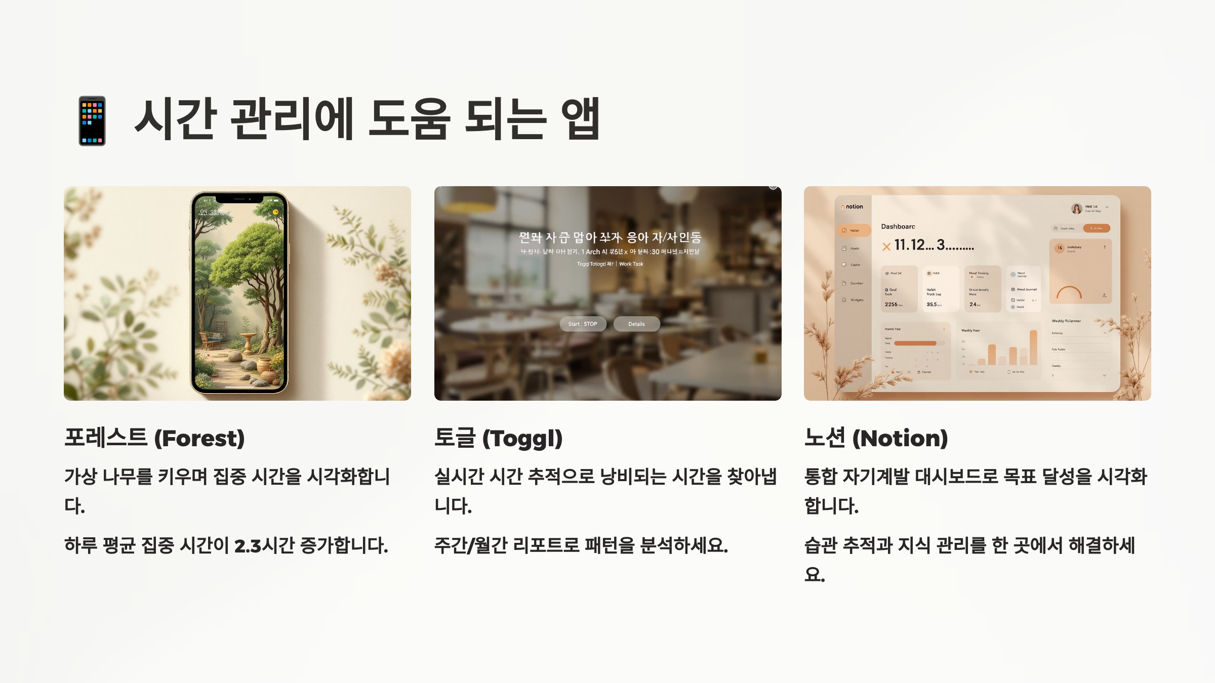 다음은 📱 시간 관리에 도움 되는 앱이에요. 스마트폰을 똑똑하게 쓰면, 자기계발에 진짜 도움 되는 도구가 될 수 있어요!