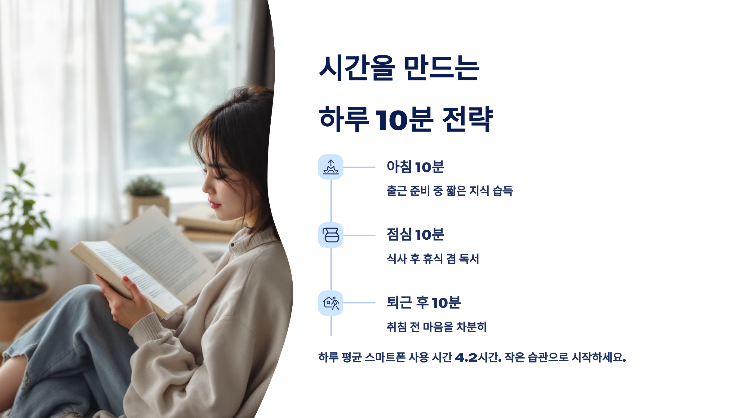- 퇴근 후 스마트폰 보기 전 → 딱 10분 먼저 책 보기 도전