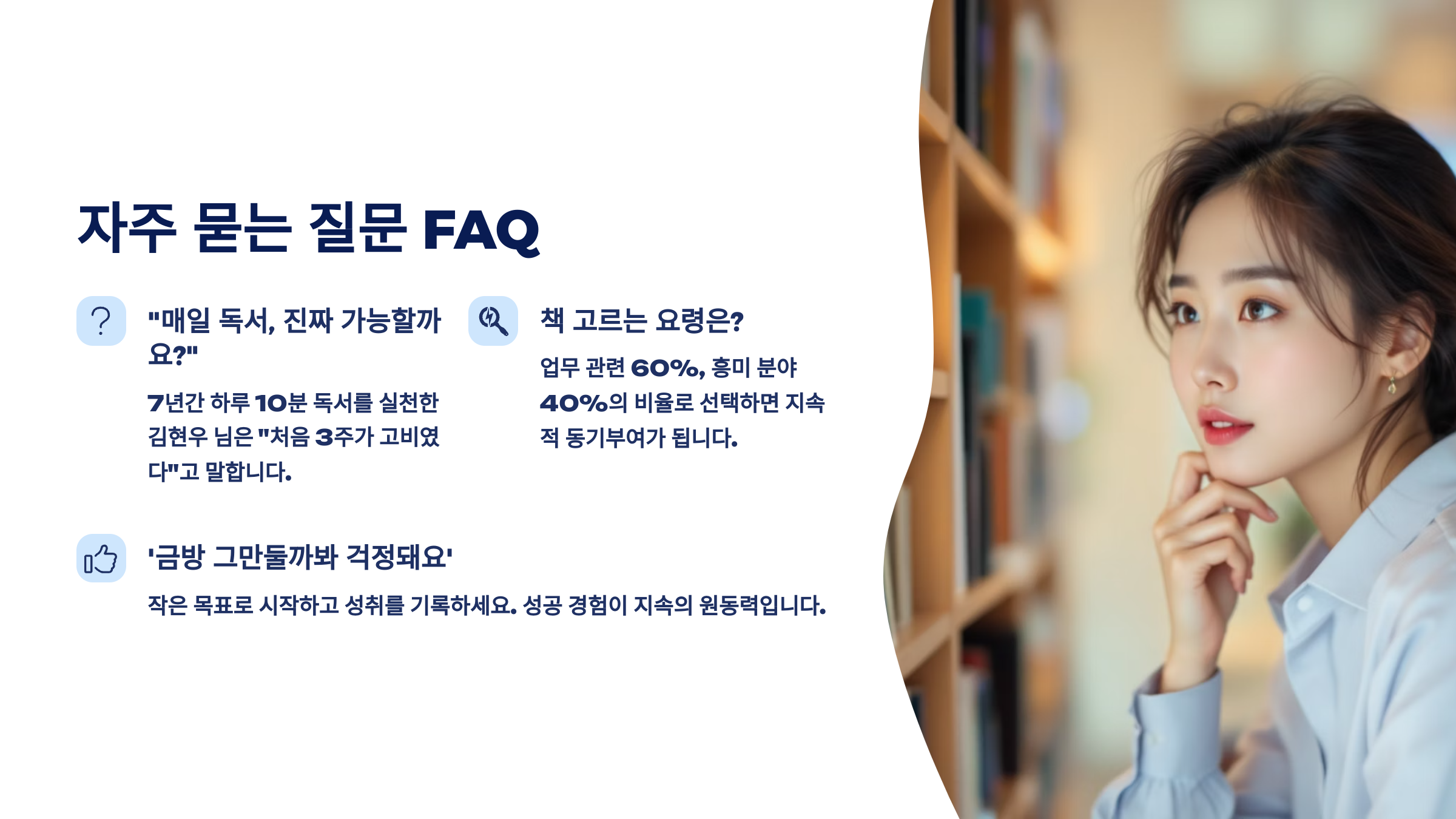 이제 다음은 ❓ FAQ예요. 직장인 독서에 대해 자주 받는 질문 8가지를 깔끔하게 정리해드릴게요!