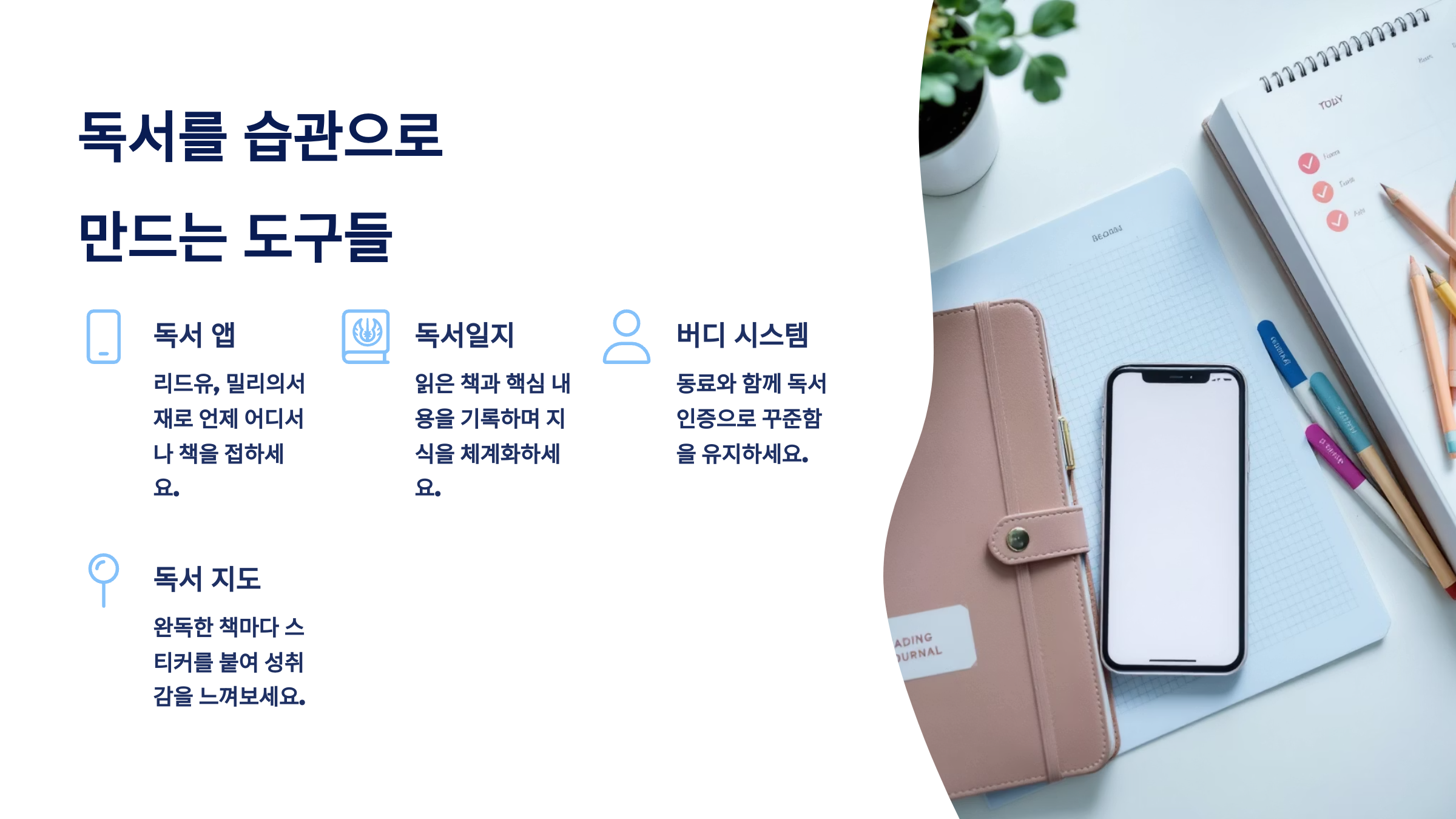 - 전자책, 오디오북, 독서노트 등 도구도 적극 활용해요