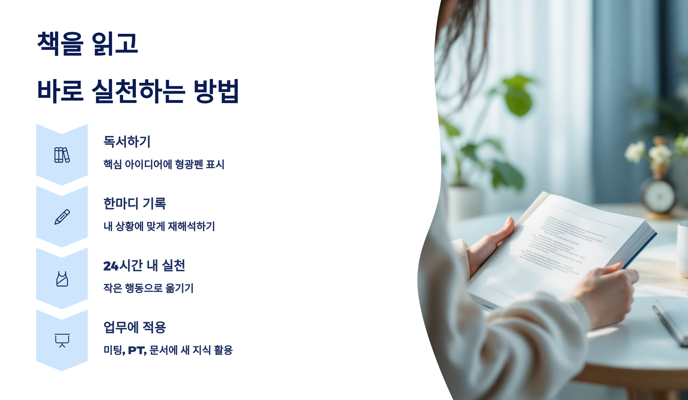 이제 다음은 📓 책을 읽고 바로 실천하는 방법이에요. 읽기만 하고 끝내지 않도록, 독서를 ‘행동’으로 바꾸는 비법을 소개할게요!