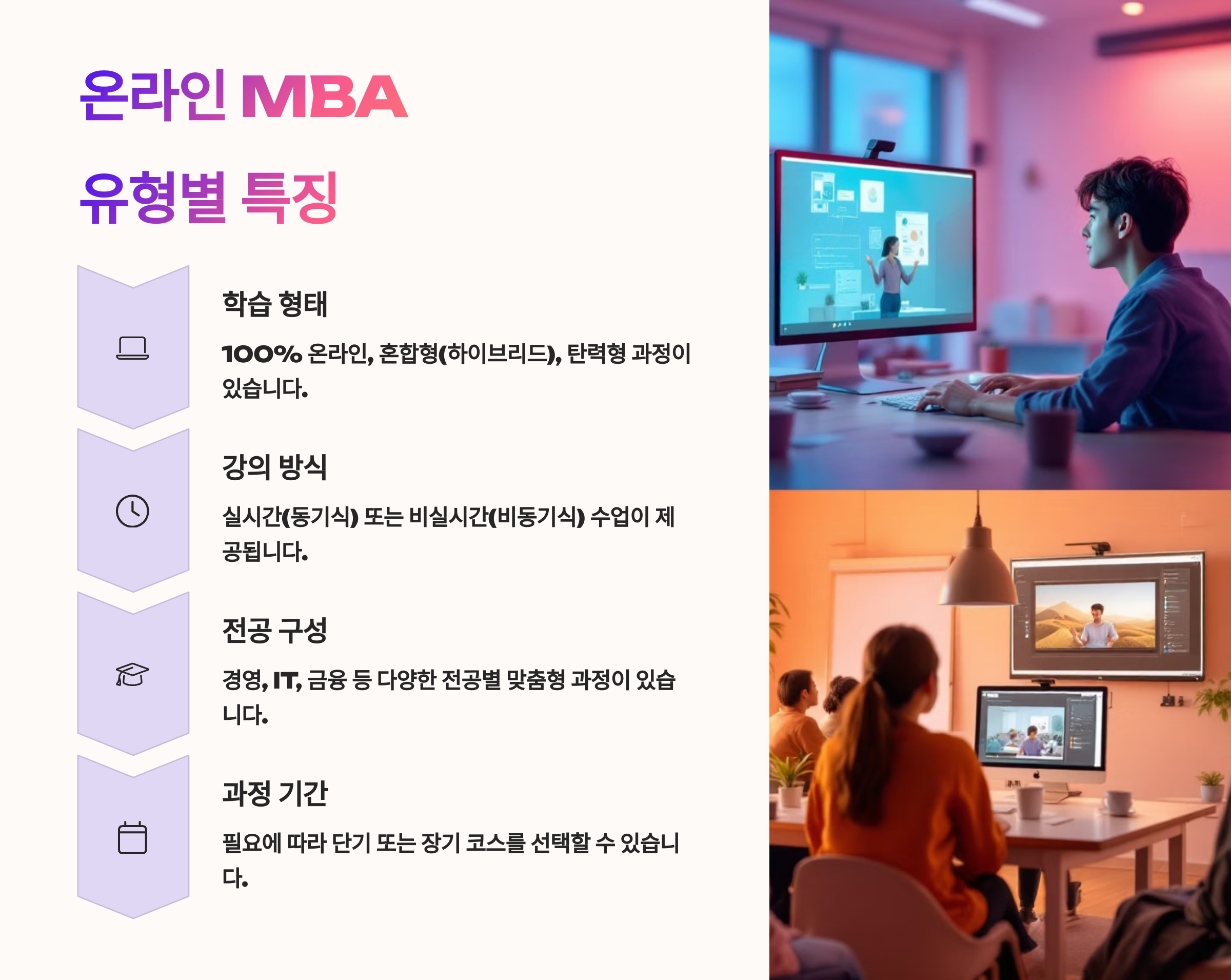국내에도 실무 중심의 강의를 제공하는 온라인 MBA 과정이 점점 확대되고 있어요. 대기업 재직자, 중소기업 대표, 스타트업 창업가 등 다양한 수강생들이 직장과 병행하면서 수강 가능한 프로그램을 선호하고 있죠. 💼📚