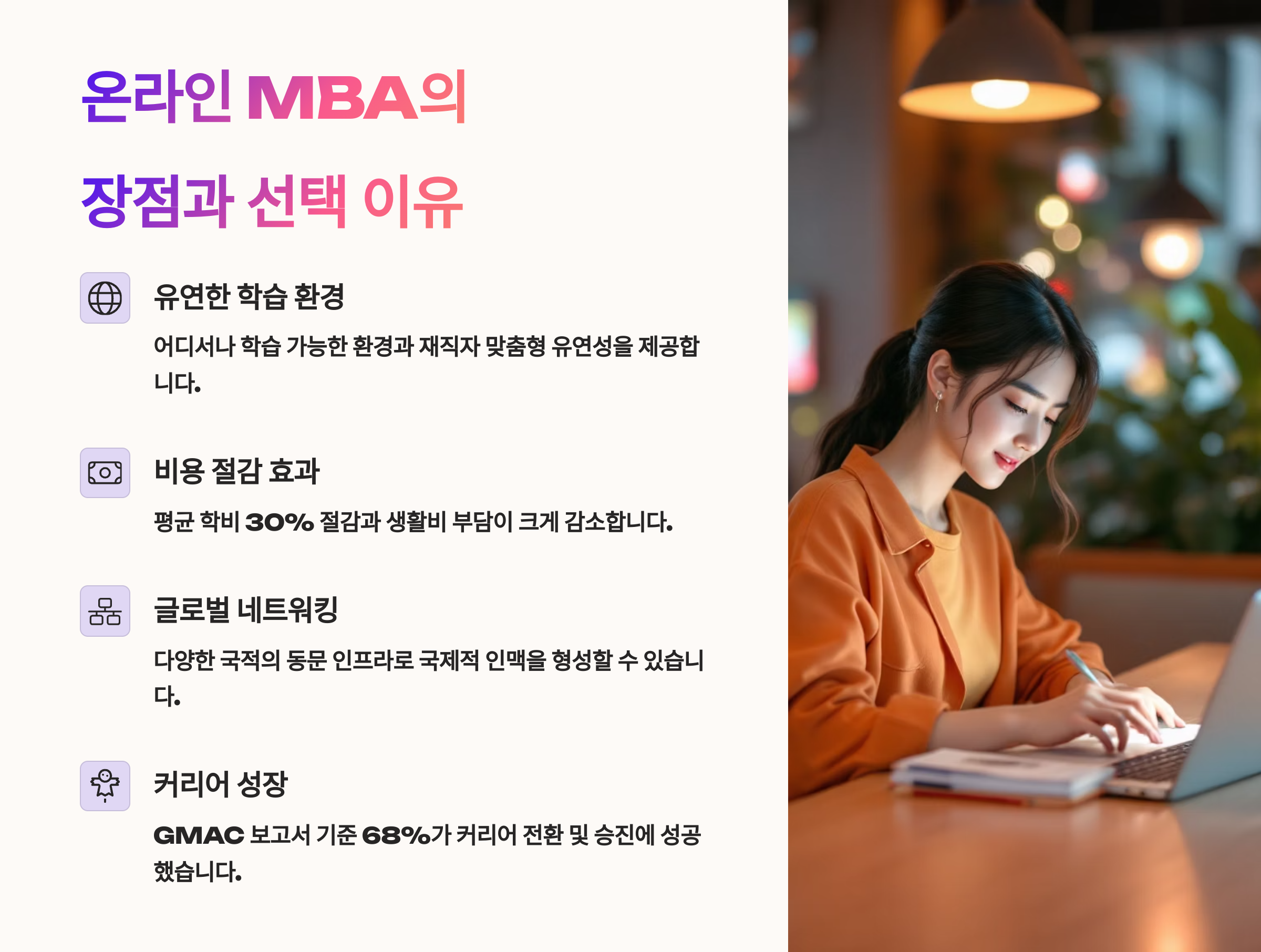 온라인 MBA는 전통적인 캠퍼스 MBA와 달리 시간, 장소의 제약 없이 공부할 수 있다는 점에서 직장인, 부모, 해외 거주자, 30대 이상 학습자에게 매우 매력적인 선택지예요. 실무와 병행하면서 커리어 전환을 고려하는 사람들에게 특히 강력한 옵션이에요. 🧳