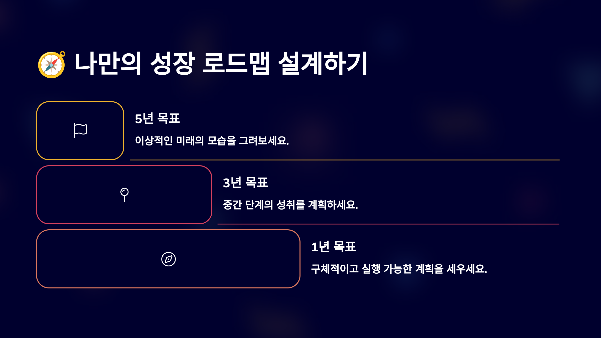 📌 자기계발은 단기 목표 몇 개로 끝나지 않아요. 장기적인 삶의 방향성이 잡혀 있어야 흔들리지 않고 계속 나아갈 수 있어요. 바로 그걸 도와주는 게 ‘성장 로드맵’입니다.