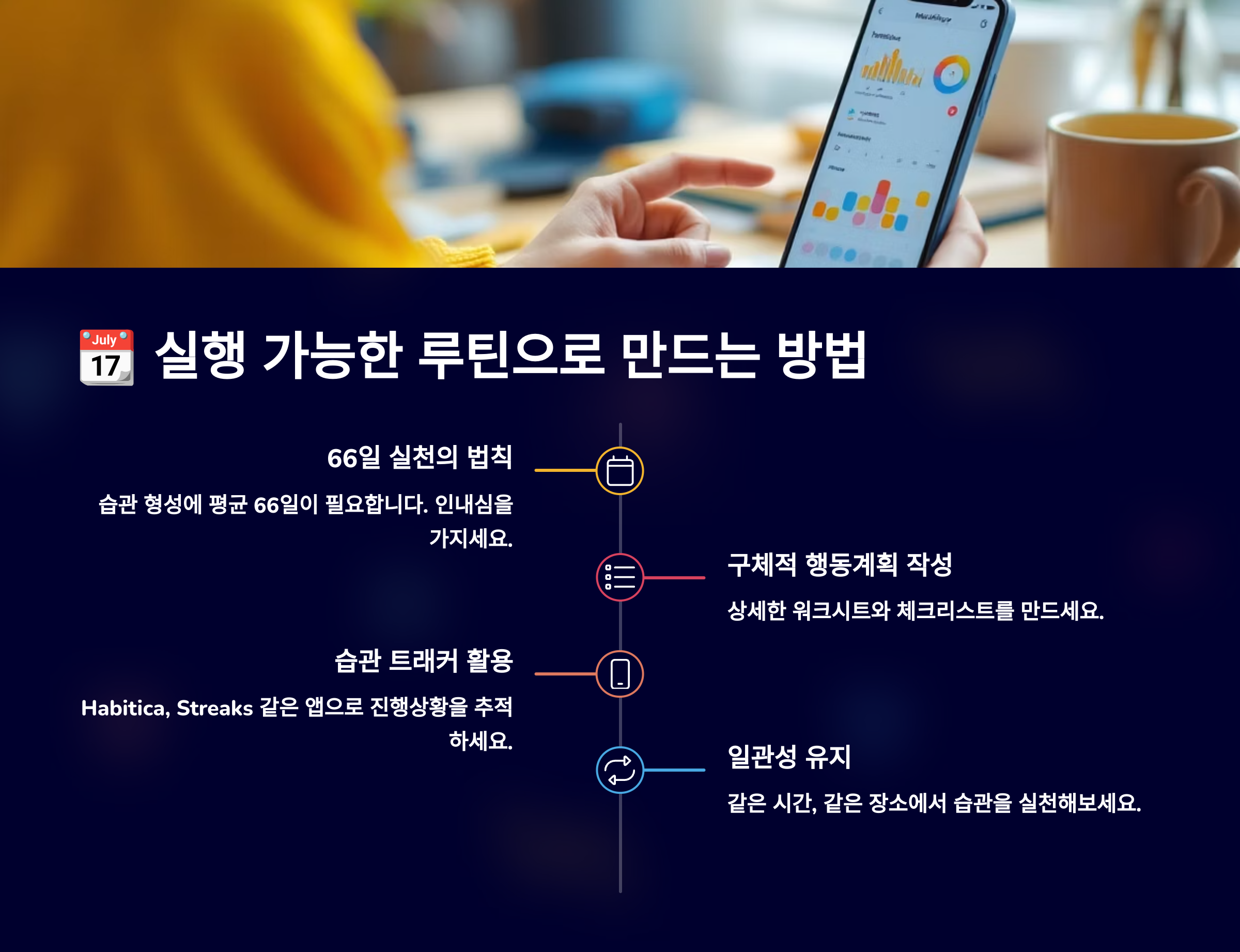 📌 목표를 달성하는 사람들의 공통점은 의지력보다 루틴에 의존한다는 거예요. 의지는 소모되지만 루틴은 습관이 되면 힘이 들지 않아요. “매일 1%씩 변화하는 루틴”이 결국 큰 성장을 만들어요!