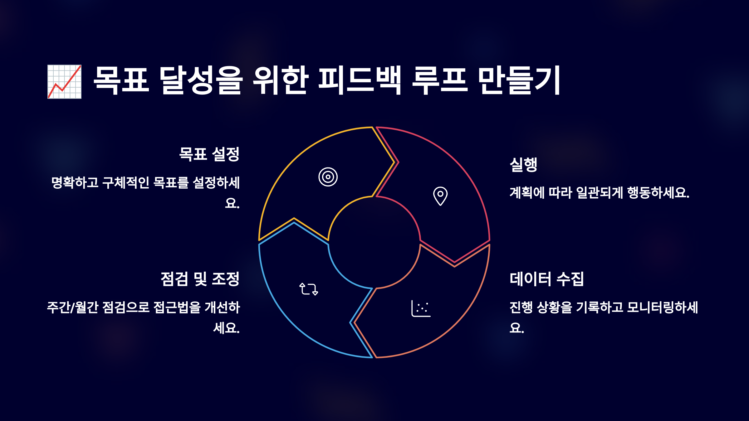 📌 ‘잘하고 있는 걸까?’ ‘지금 이 방식이 맞는 걸까?’ 이 질문을 그냥 넘기면 목표는 멀어지고, 답을 찾으면 성장은 두 배가 돼요. 그 비결이 바로 피드백 루프입니다. 자기계발의 지속력을 만드는 핵심 전략이에요!