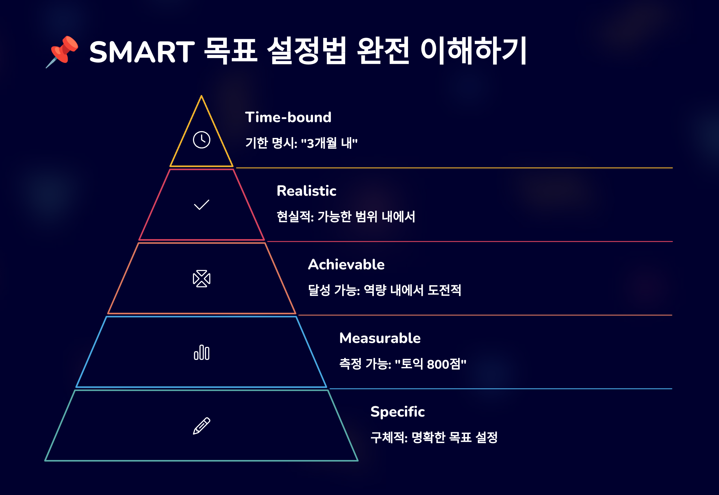 📍 예시로 볼게요. 막연한 목표: “영어 공부 열심히 하기” SMART 목표: “매주 월·수·금, 30분씩 영어 뉴스 듣고, 매주 금요일 5개 문장 말하기 훈련하기 (2개월간)” 완전 다르죠? 명확하고 측정 가능하고 기한도 있어요!