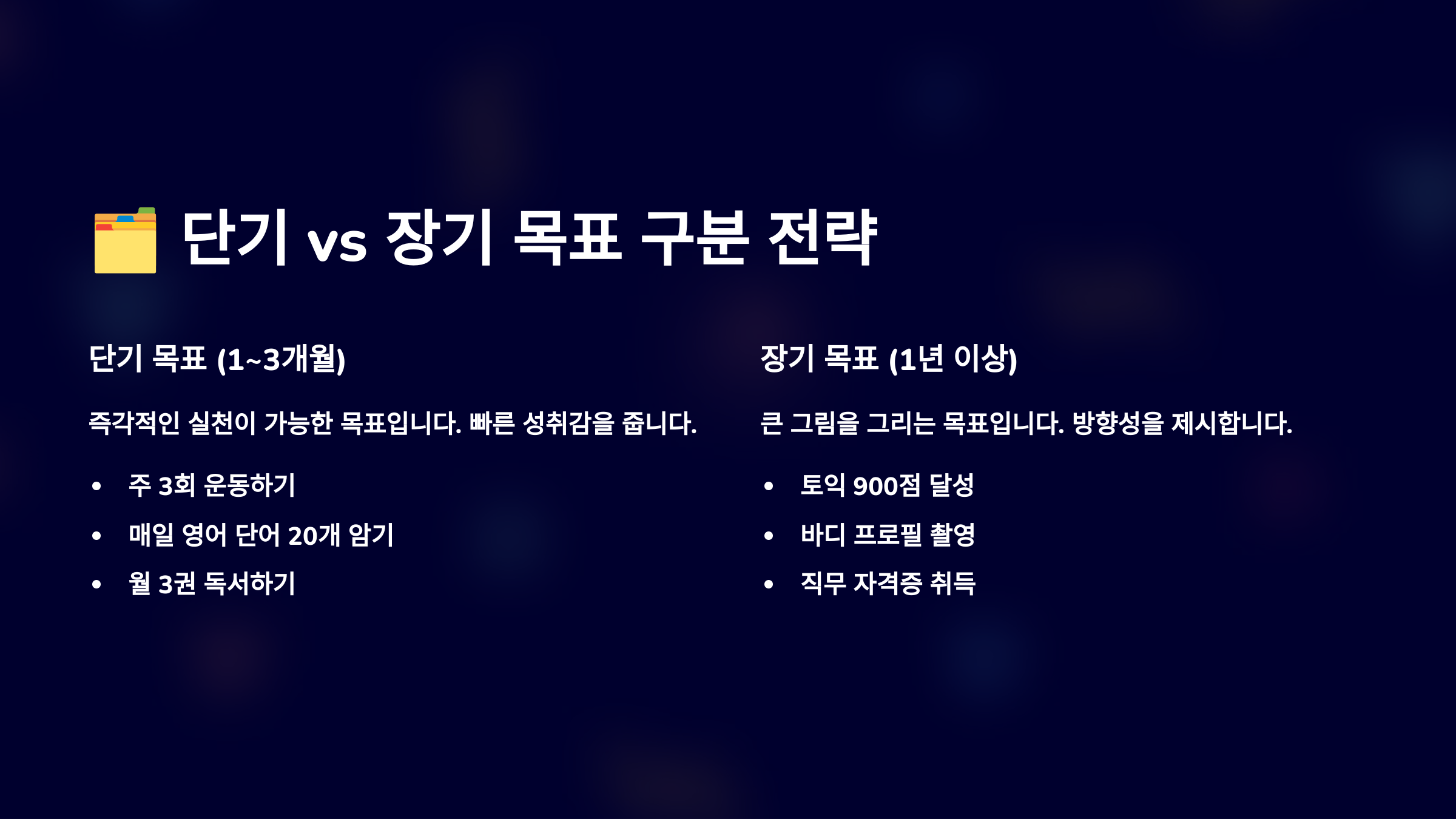 📌 목표를 이루기 위해선 단기 목표와 장기 목표를 구분해서 설정해야 해요. 많은 사람들이 “1년 뒤 ○○ 하겠다”는 큰 목표는 있지만, 정작 오늘 뭘 해야 하는지는 모르는 경우가 정말 많아요. 이럴 땐 도중에 방향을 잃고, 동기부여도 금방 떨어지죠.