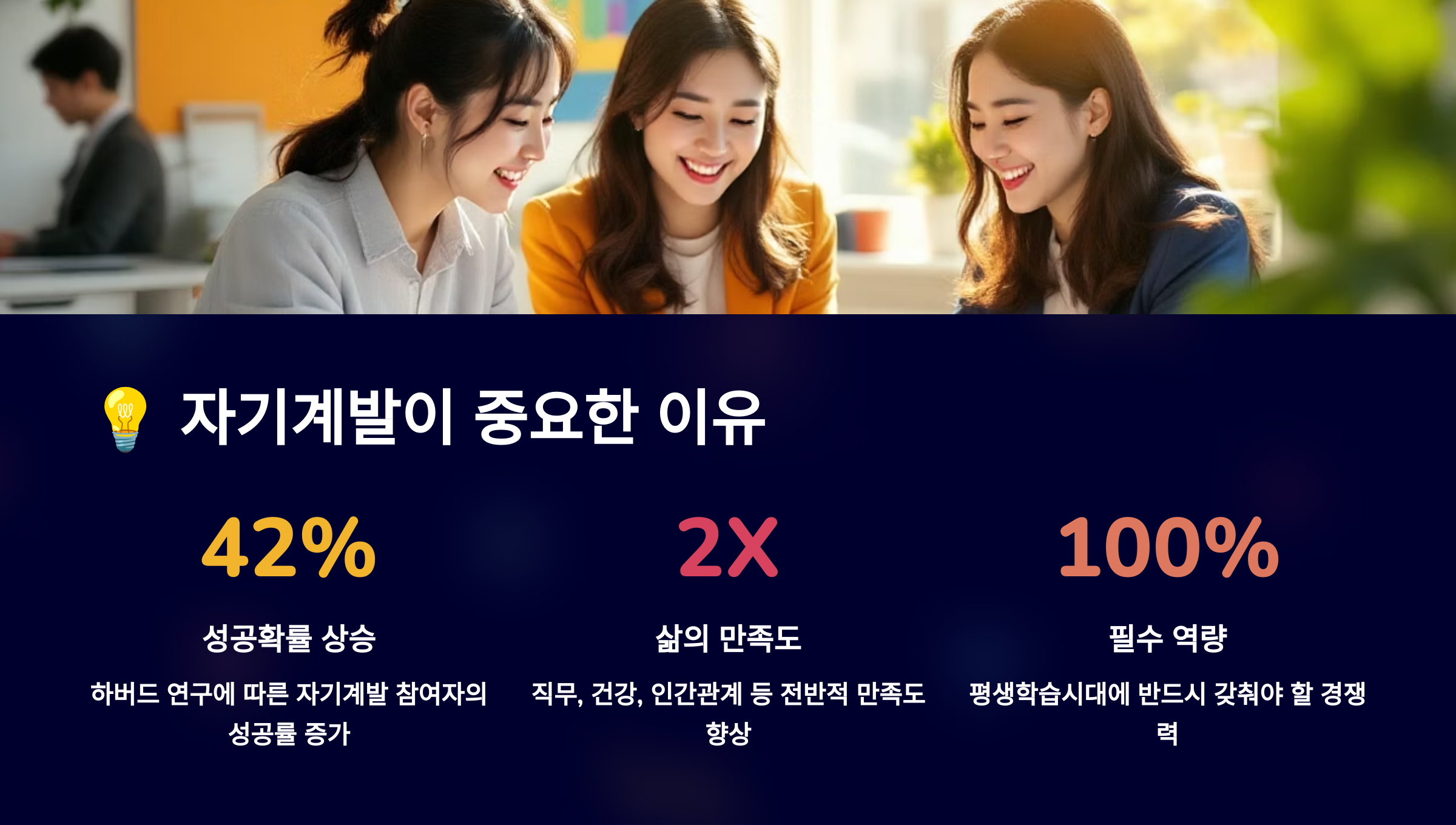 🧠 자기계발은 실제 연구에서도 삶의 만족도, 경제력, 정신 건강과 연관이 높다고 입증돼 있어요. 하버드대학교의 연구에 따르면, 꾸준한 자기계발을 하는 사람들은 5년 후 삶의 방향성이 명확하고 직업적 성공률도 60% 이상 높다는 결과가 있어요.