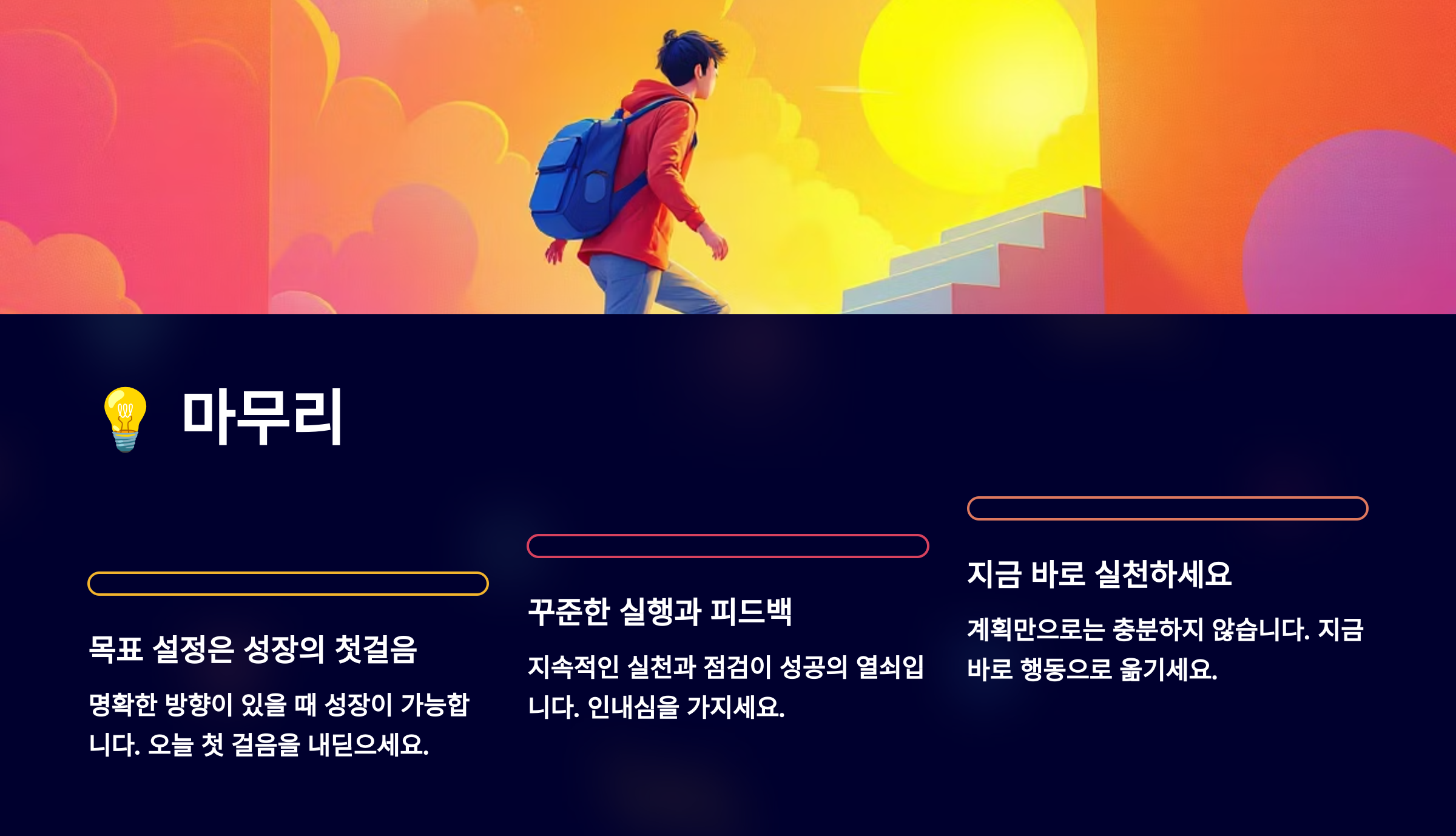 🌟 오늘 나의 행동 하나가 내일의 나를 바꿔요. 지금 시작하는 자기계발은 앞으로 1년 뒤, 5년 뒤, 전혀 다른 삶의 결과를 만들어줄 수 있어요. 지금부터는 막연한 열정이 아니라, 전략적인 목표 설정으로 시작해봐요!