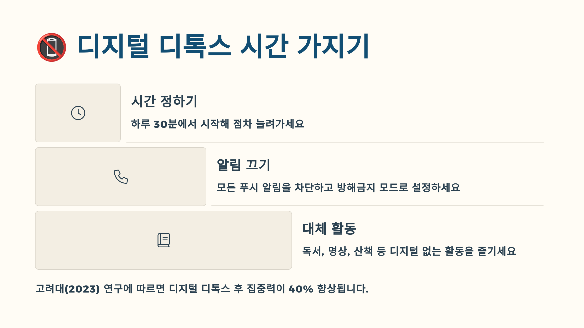 디지털 디톡스를 실천하면 집중력이 높아지고, 감정 기복도 줄어들어요. 특히 일을 하거나 공부를 할 때 집중 시간을 딱 정하고 스마트폰을 꺼두면, 결과가 훨씬 좋아진다는 걸 경험하게 될 거예요. 📵🧠