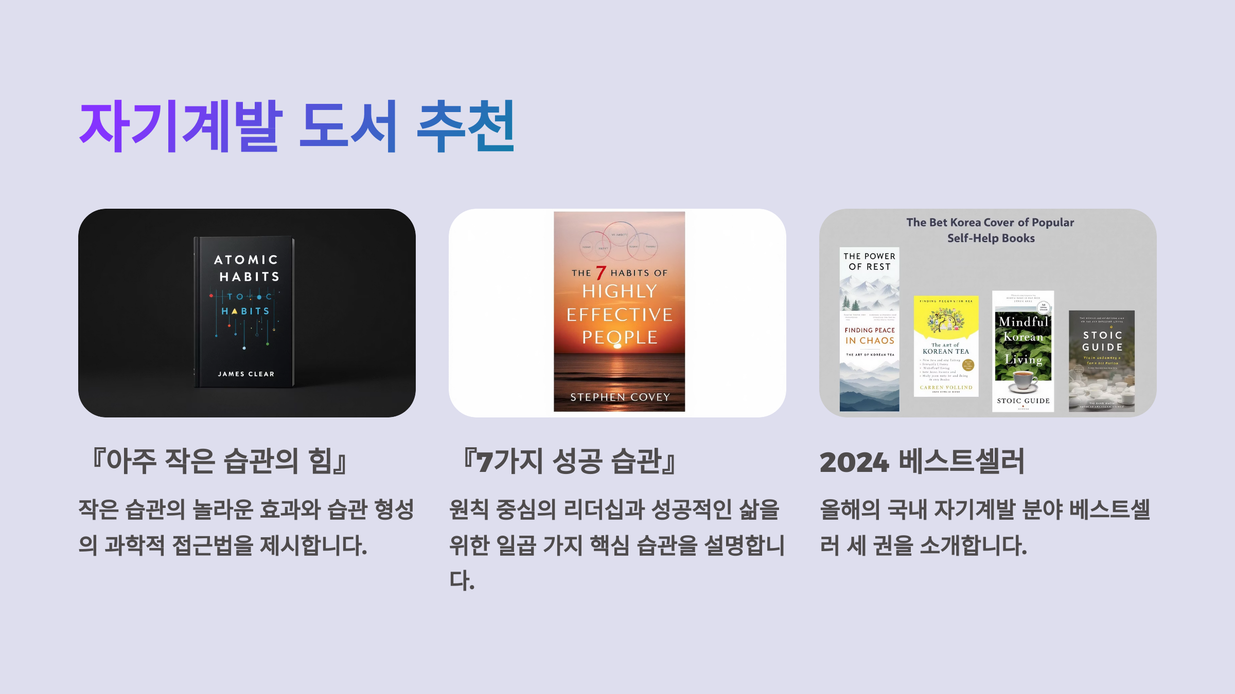 이제 다음은 📖 도움 되는 자기계발 도서 추천 시작이 막막하다면 책으로 힌트를 얻어보는 것도 좋아요!