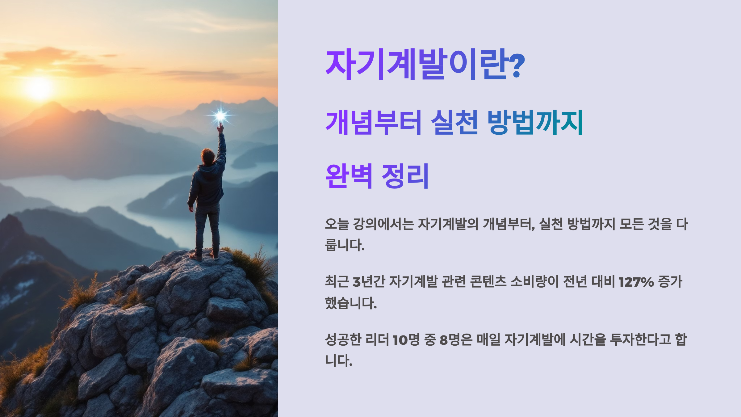 자기계발은 더 나은 미래를 위한 도전이지만, 꼭 거창하거나 완벽할 필요는 없어요. 하루 10분이라도 나를 돌아보고, 더 나은 방향을 고민하는 것, 그 자체로 이미 자기계발이에요.
