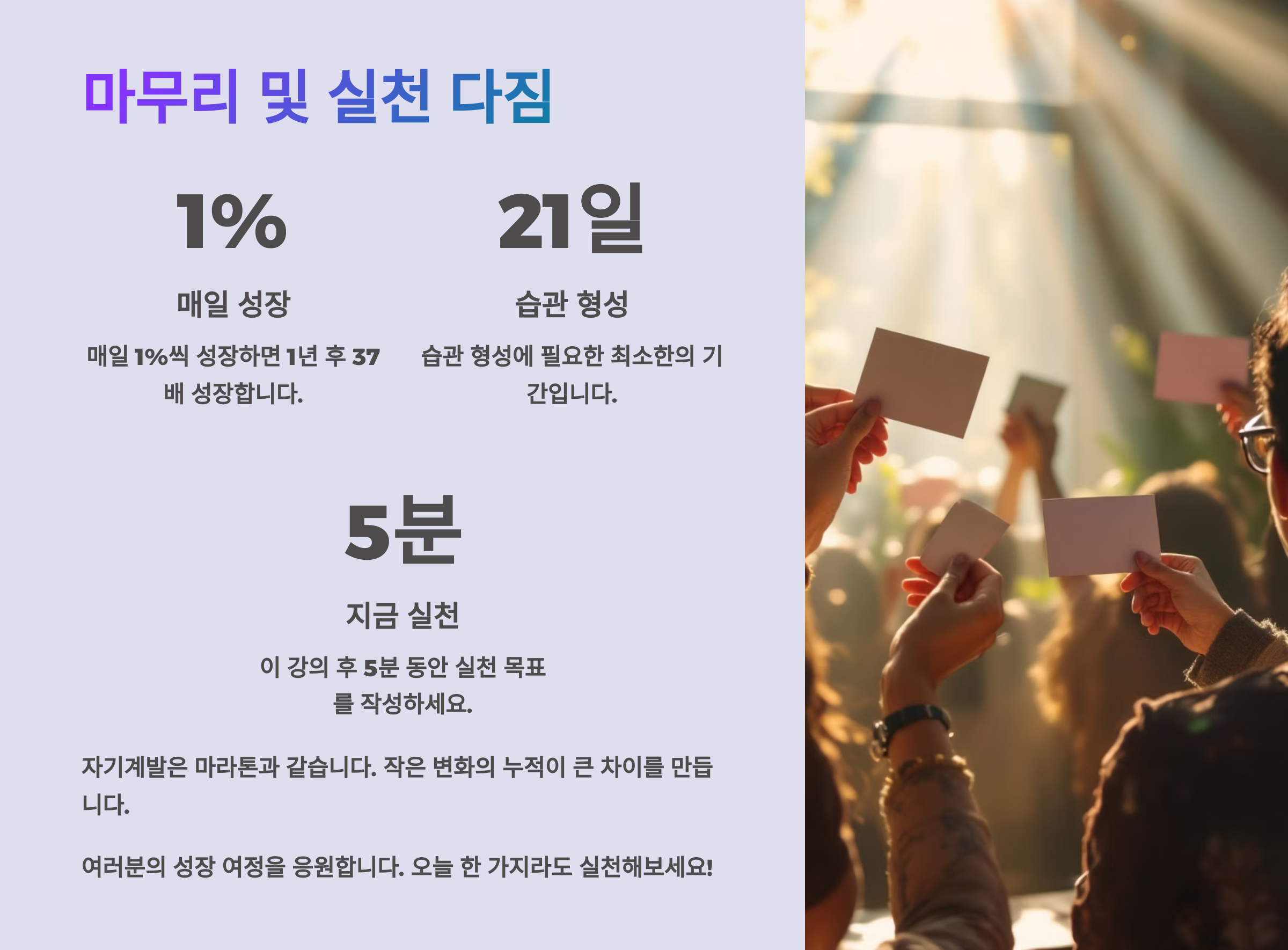 자기계발은 ‘결과 중심’보다는 과정 중심으로 접근해야 해요. 작은 목표를 반복하고, 점점 루틴으로 만드는 게 핵심이죠!