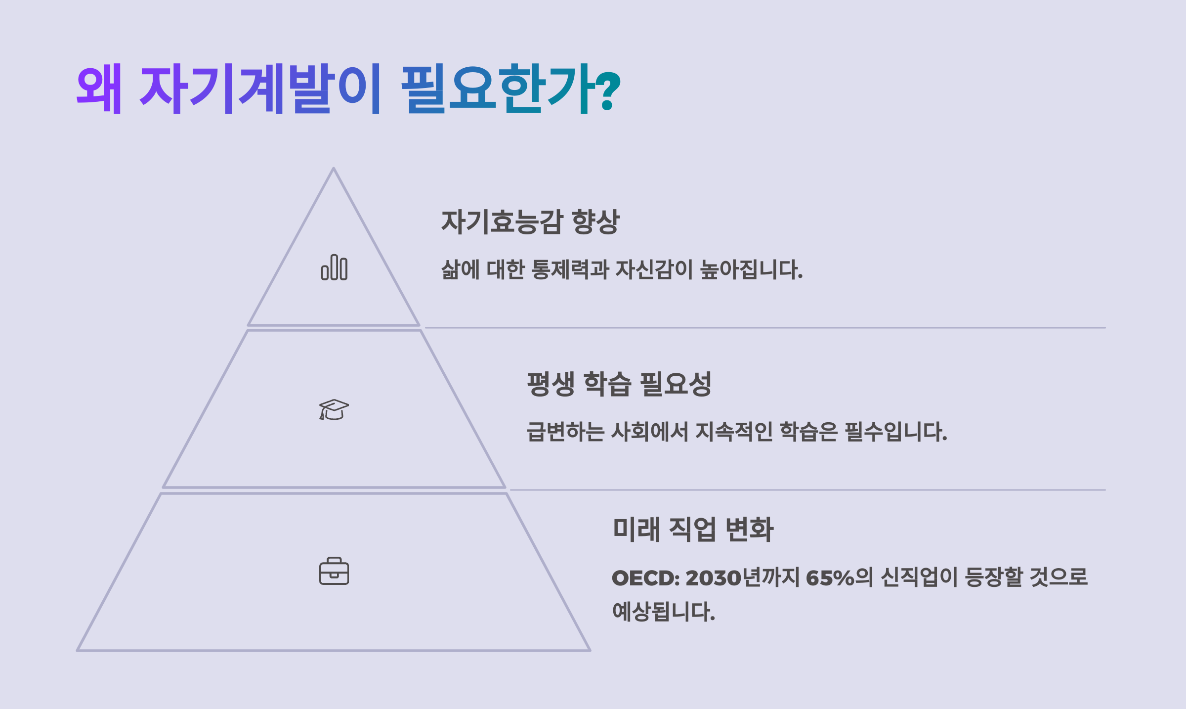 자기계발이 필요한 이유는 단순히 성공하거나 더 많은 돈을 벌기 위해서가 아니에요. 자신의 가능성을 스스로 확인하고, 삶의 만족도를 높이기 위한 선택이죠.