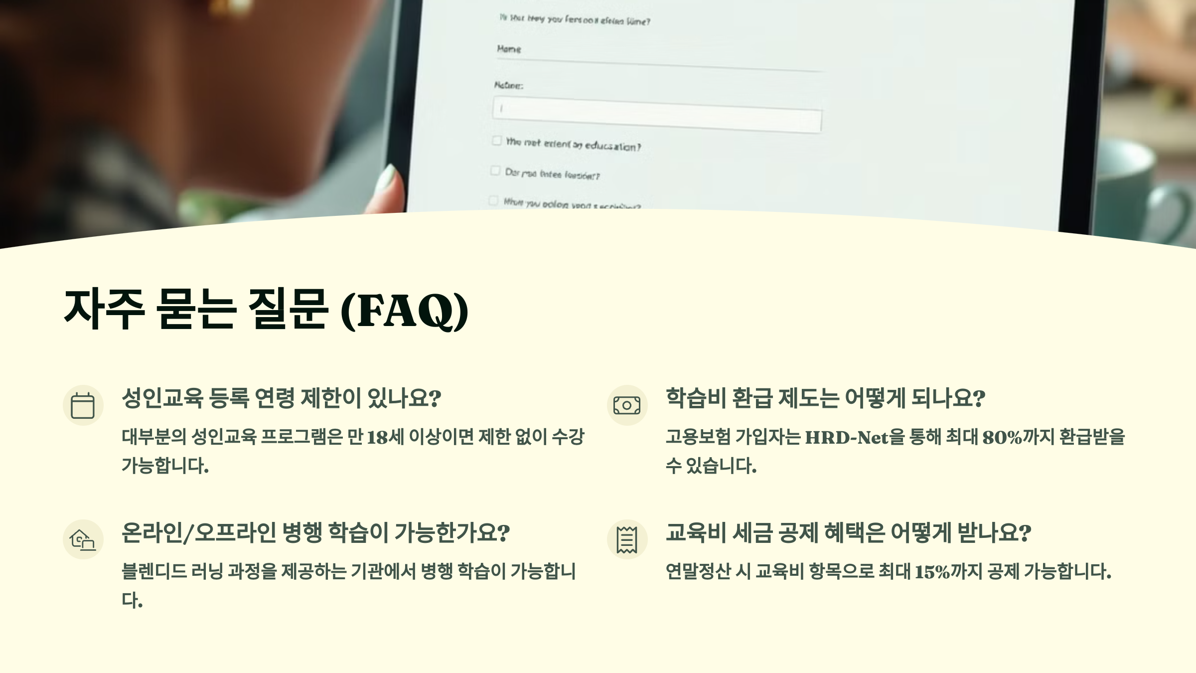 이제 ❓ FAQ 성인교육 관련해서 자주 묻는 질문 8가지를 알려드릴게요!