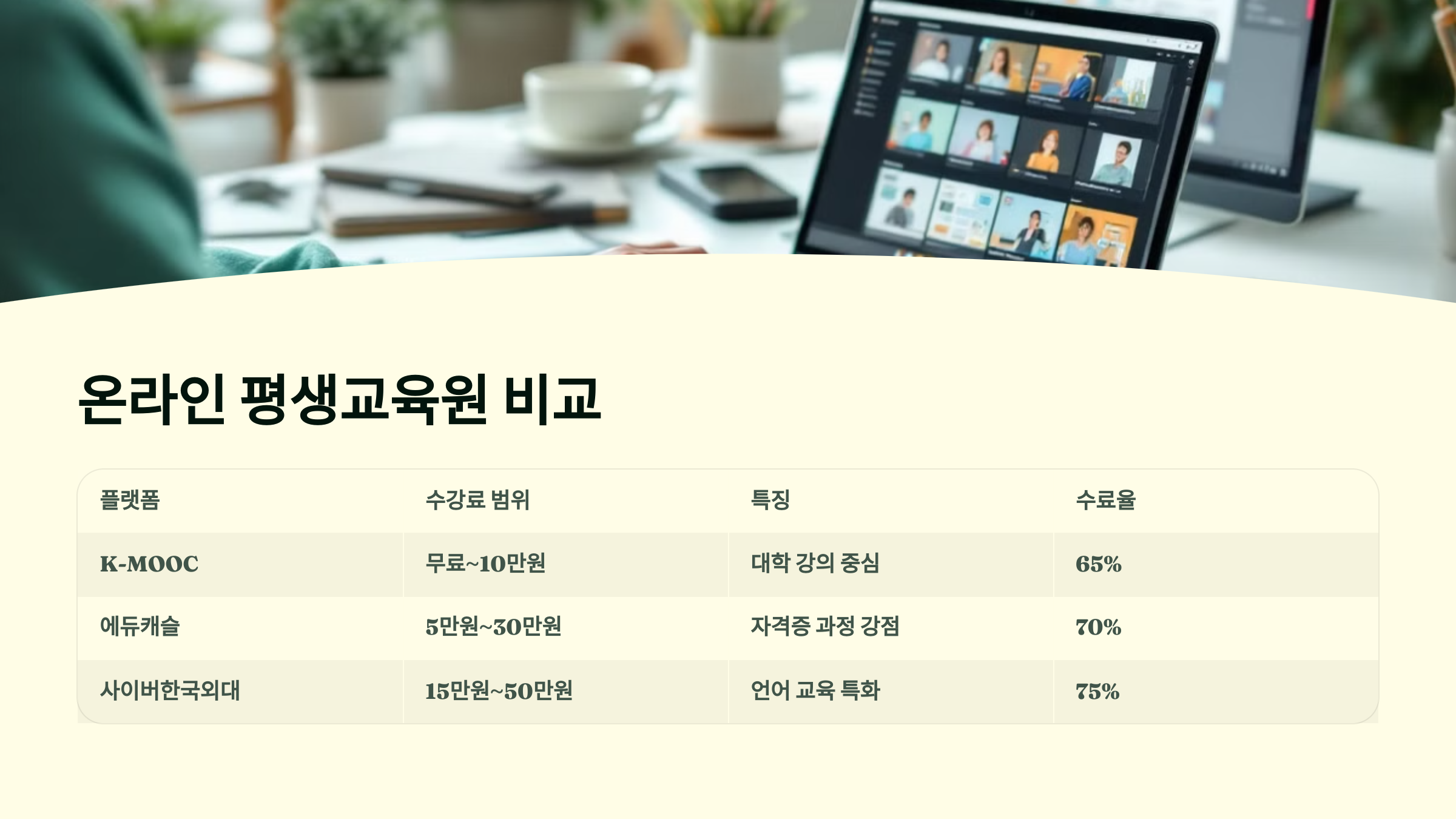 💻 온라인 평생교육원은 시간이 부족한 직장인, 전업주부, 은퇴자에게 맞춤형 학습 환경을 제공해요. 국가평생교육진흥원에서 인증받은 학점은행제 운영 교육기관부터 자격증 중심의 민간 플랫폼까지 다양하게 존재하죠.