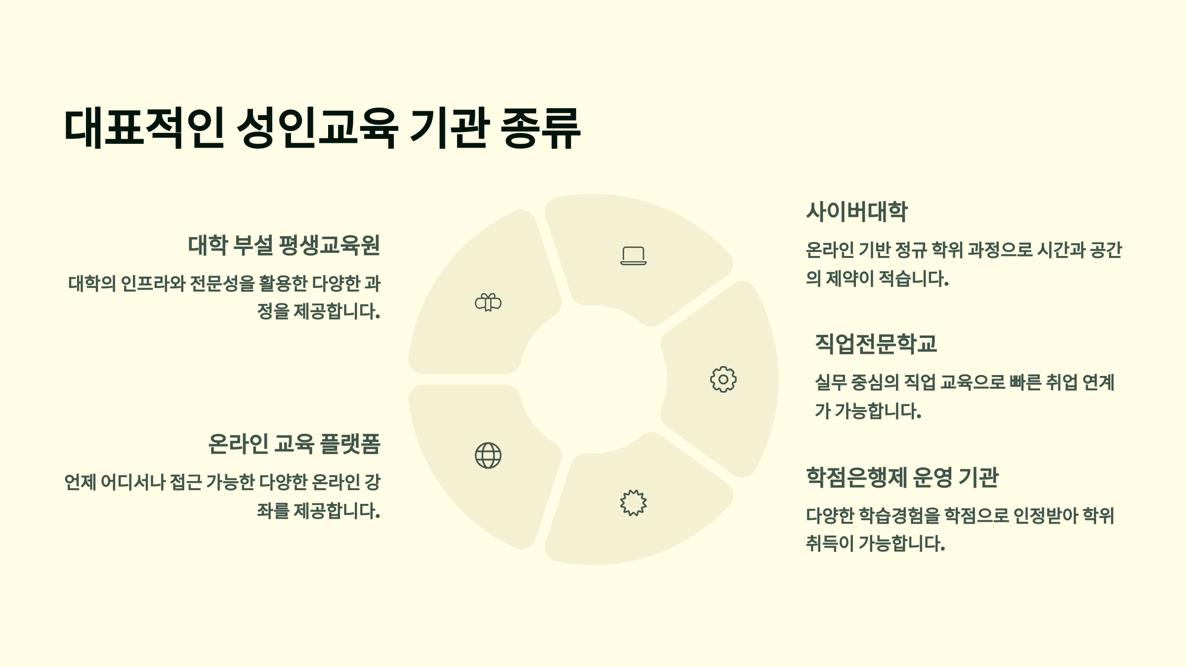 📝 성인교육은 단기 강의부터 정규 학위까지 시간과 비용이 제법 드는 장기 프로젝트일 수 있어요. 그래서 교육기관 선택이 곧 학습 성공의 시작이라고 해도 과언이 아니에요!