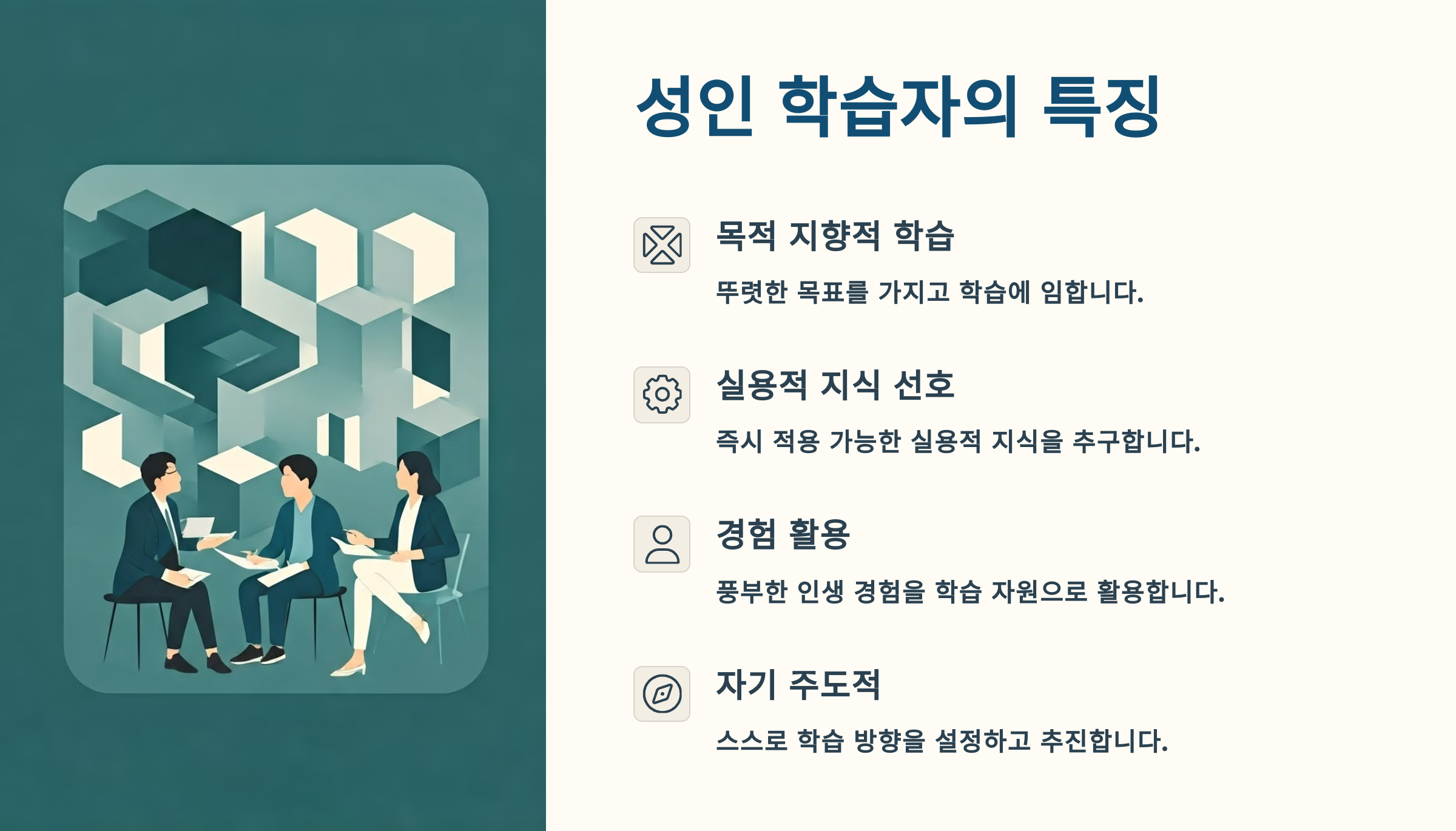 📘 아이들은 선생님이 말하는 걸 그대로 따라 배우지만, 성인은 자신의 삶과 연결되어야만 흥미를 느끼고 몰입해요. 이게 성인 학습자의 가장 큰 특징이에요.