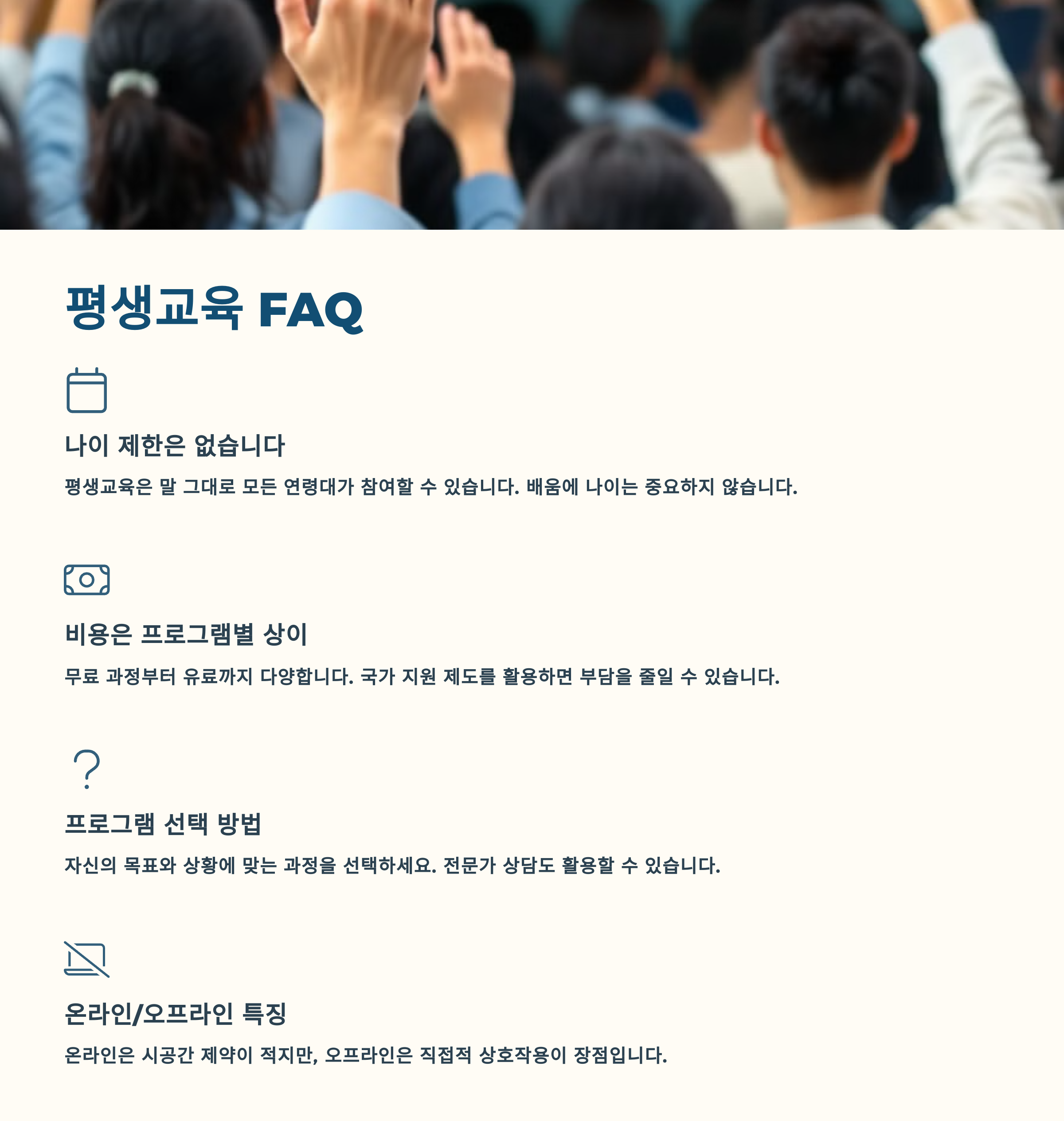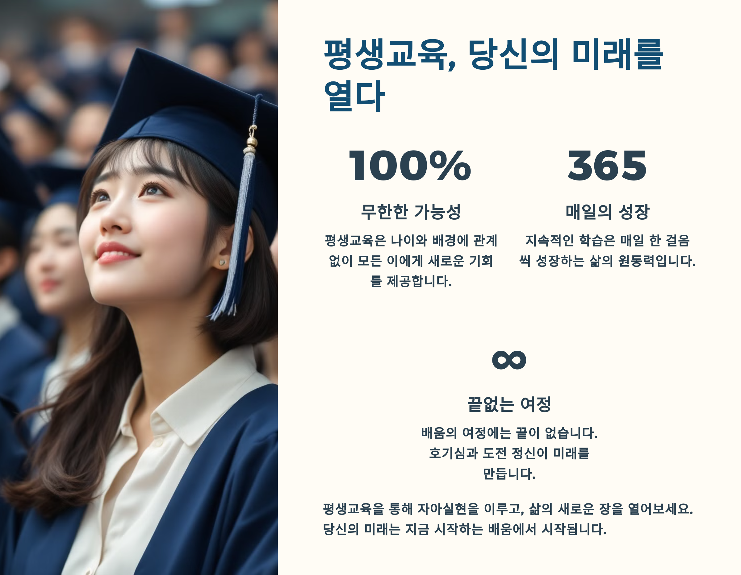 📘 과거에는 정해진 나이에 학교를 다니고 졸업하면 끝이었지만, 요즘은 나이에 상관없이 다시 배우고, 새롭게 시작하는 사람들이 정말 많아졌어요. 그게 바로 평생교육의 시대라는 거예요.