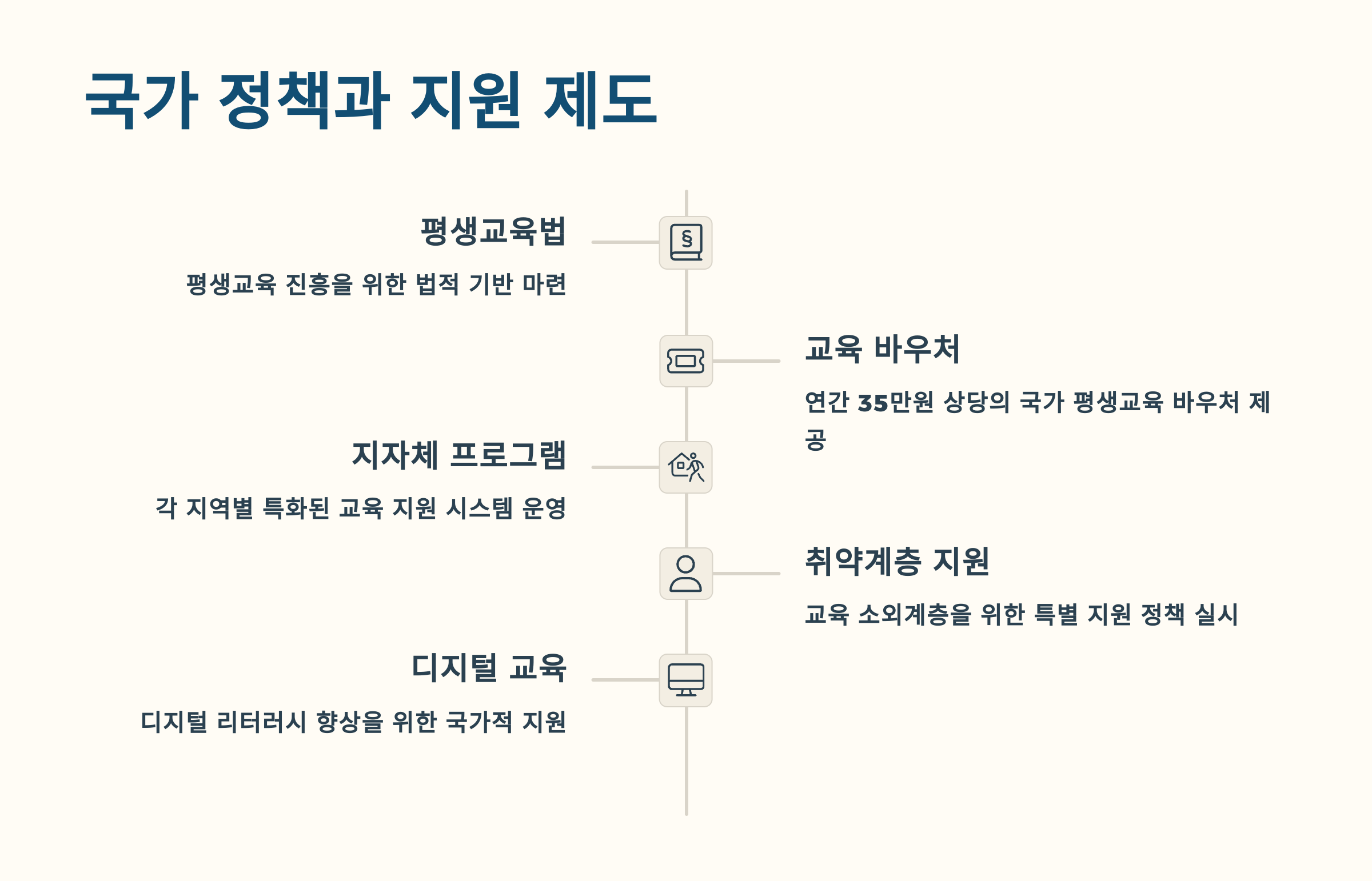 📈 우리나라 정부는 “모든 국민은 평생 학습자”라는 원칙 아래 다양한 정책을 운영하고 있어요. 나이, 직업, 학력과 관계없이 누구나 배울 수 있도록 돕는 제도들이 마련돼 있어요.