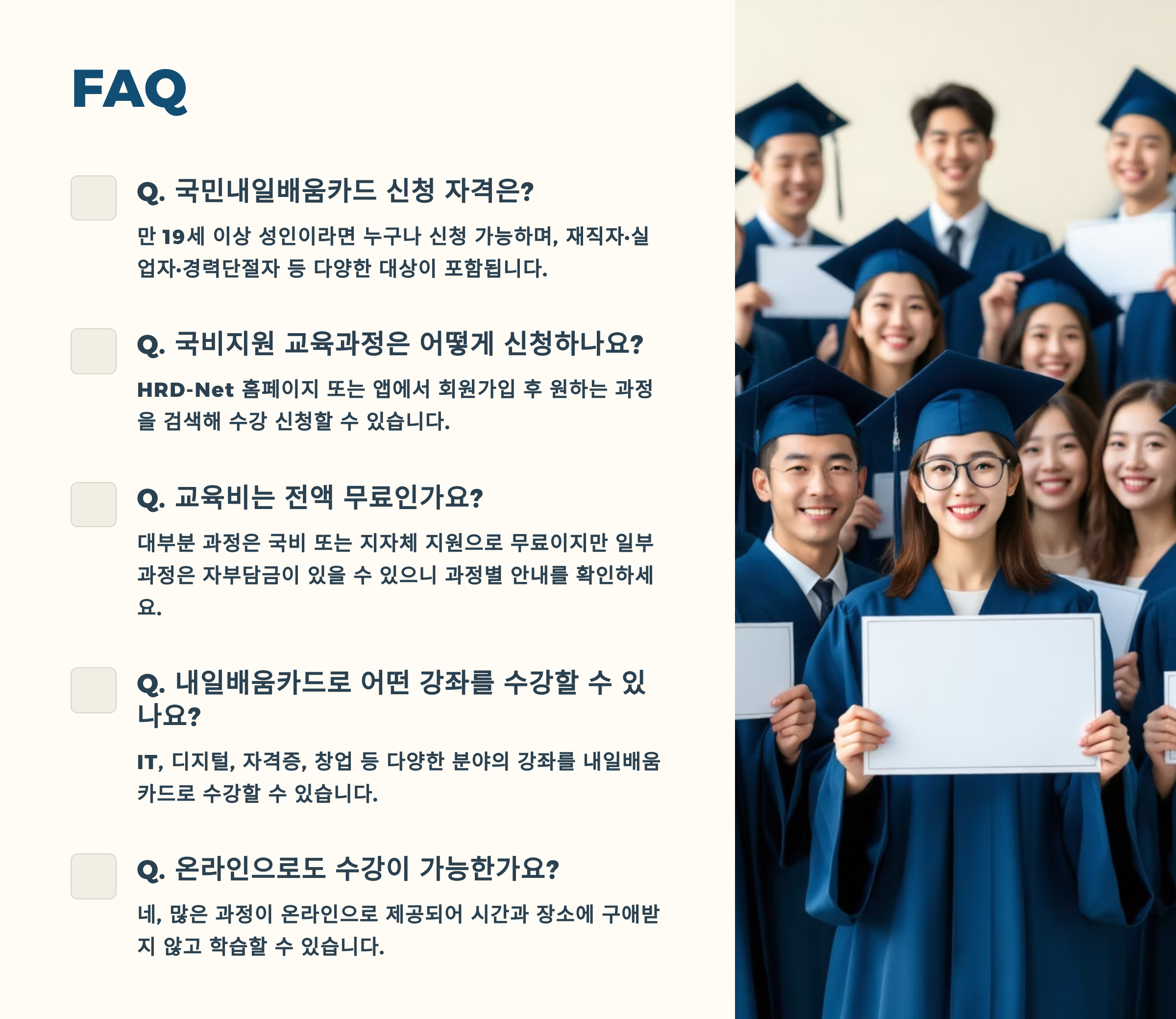 A8. 중도 포기 횟수가 누적되면 국민내일배움카드 사용이 제한될 수 있어요. 꼭 신중히 선택하고, 출석률 80% 이상 유지하는 게 기본이에요! ⏱️