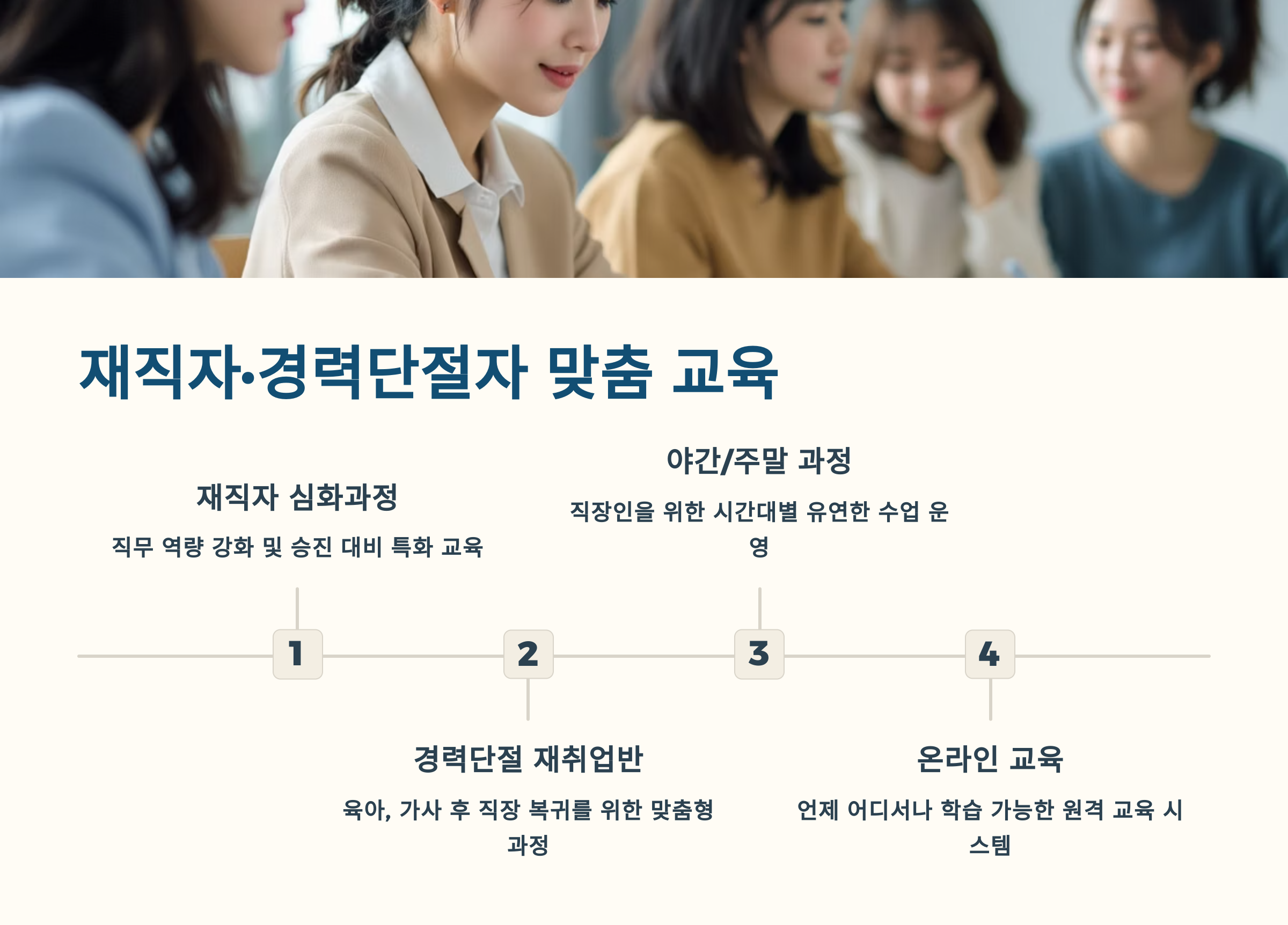 무료교육이라고 하면 실업자 중심으로 생각하기 쉬운데요, 재직자와 경력단절자 대상의 맞춤형 교육도 굉장히 많아요! HRD-Net에서는 재직자 전용 과정이 따로 마련되어 있고, 지자체나 여성인력개발센터에서도 직장인 대상 저녁반, 주말반 과정이 다양하게 운영되고 있답니다.