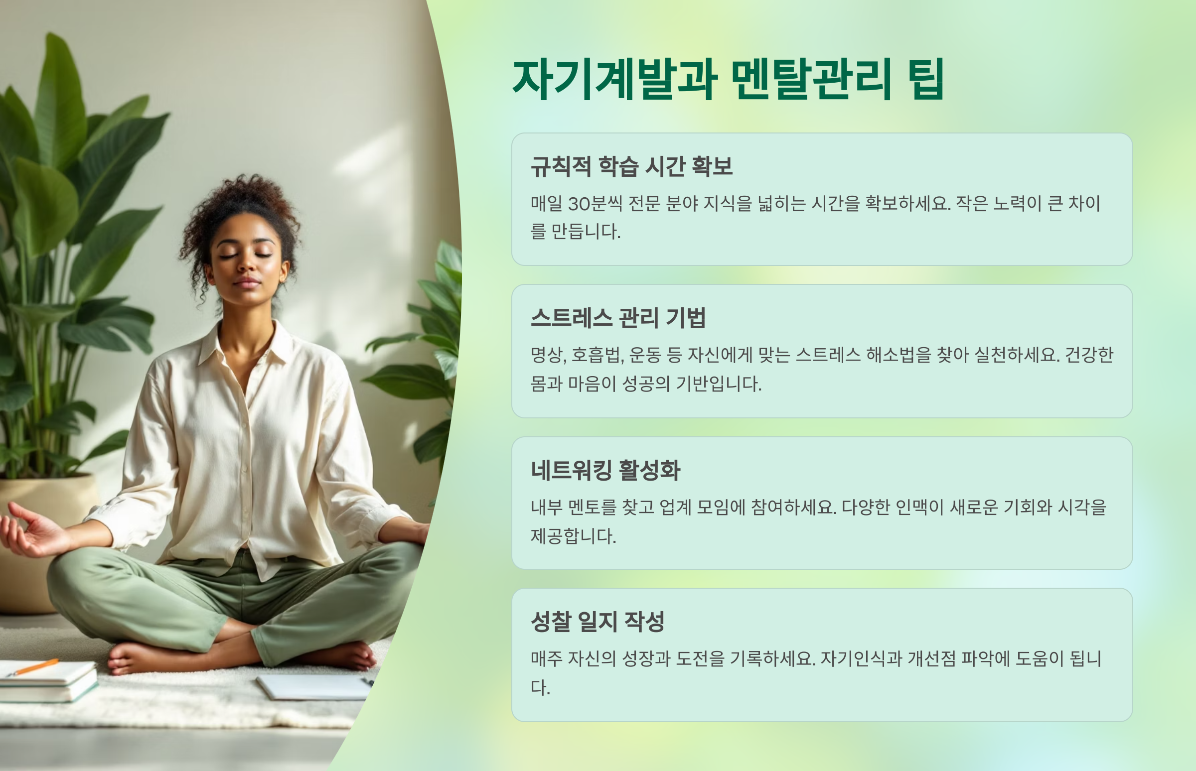 승진 준비는 단거리 달리기가 아니에요. 꾸준함과 회복력을 기반으로 하는 장기 프로젝트예요. 자기계발과 멘탈 관리가 뒷받침되지 않으면 중간에 포기하거나 소진되기 쉬워요. 😩