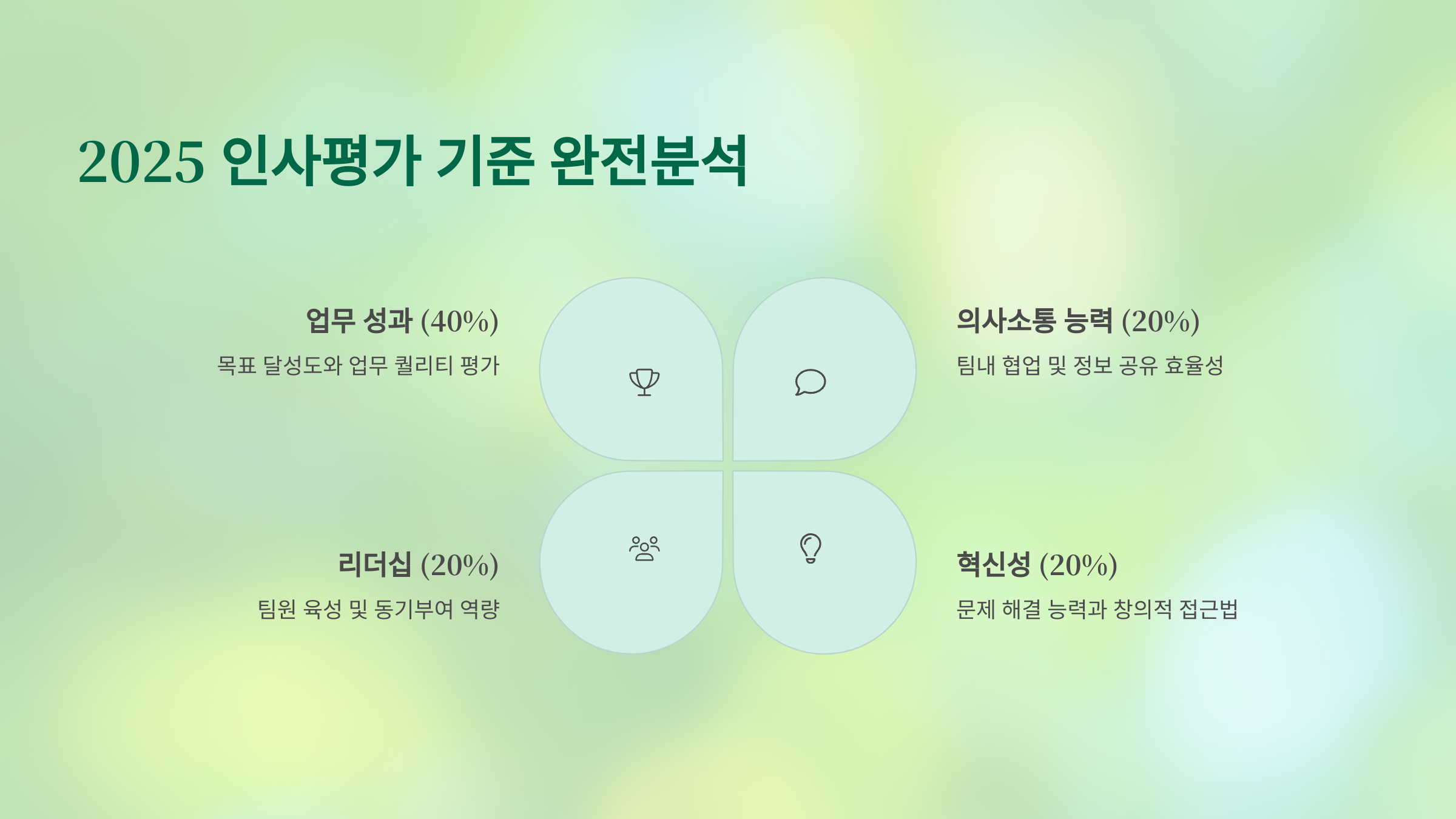 | 성과 (KPI) | 목표 달성률, 매출 기여, 프로젝트 완성도 | 50% | 정기 보고서 + 수치화된 결과 |