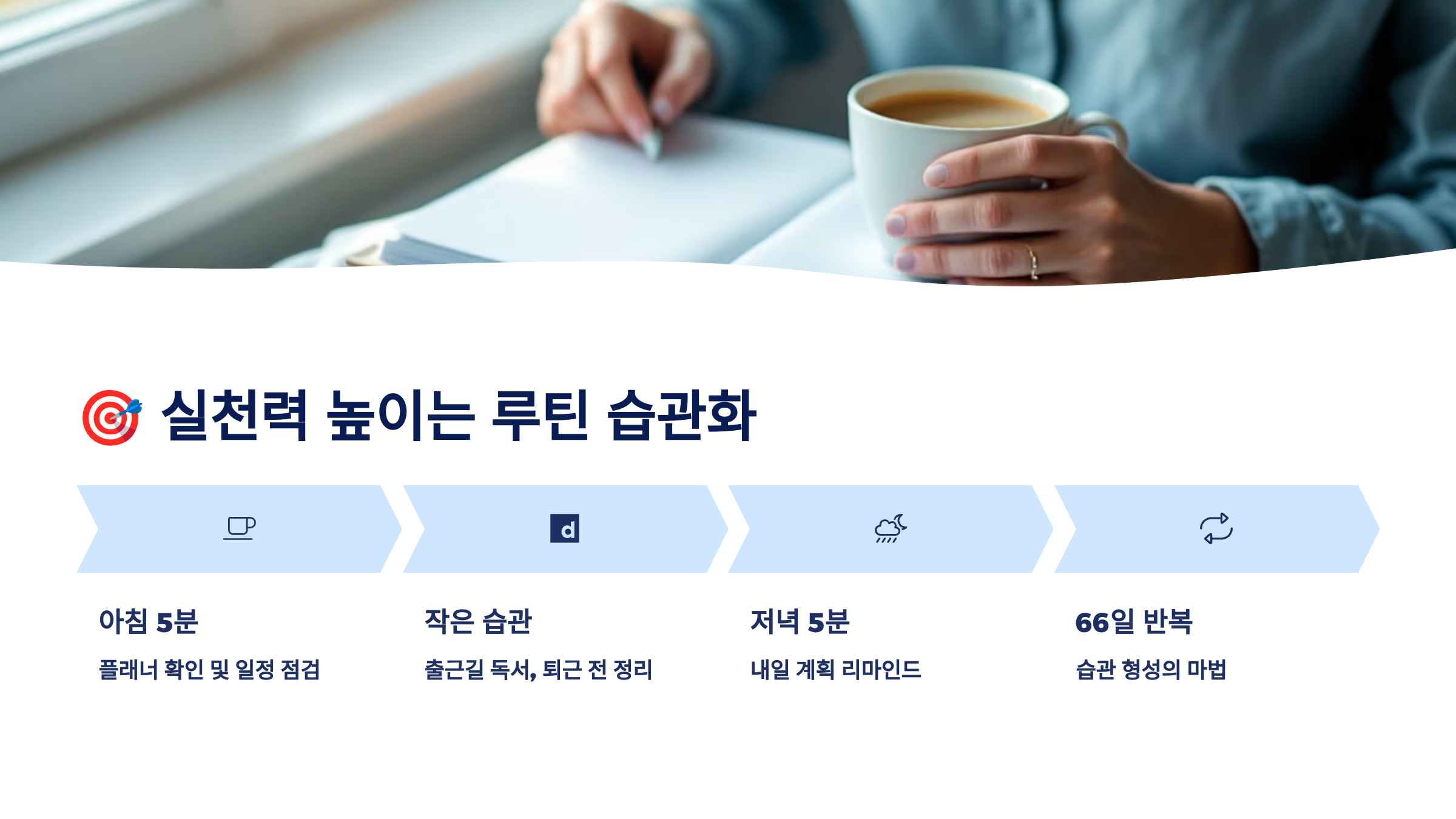 계획보다 중요한 건 루틴! 매주 작은 루틴 하나씩 늘려가는 것도 좋은 전략이에요. 플래너는 습관을 디자인하는 도구라는 걸 기억해보세요. 😉🖊️