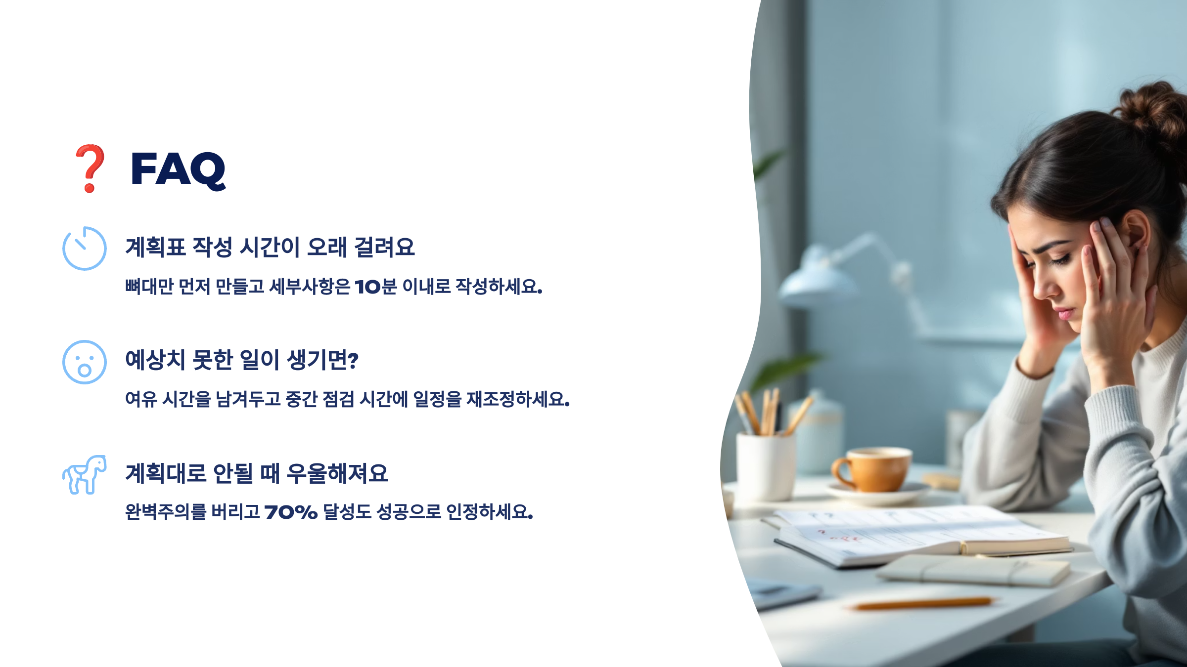 A4. 처음엔 그럴 수 있어요. 하지만 익숙해지면 5~10분이면 충분해요. 루틴화되면 쓰는 시간도 줄고 오히려 시간을 벌게 돼요! ⏱️