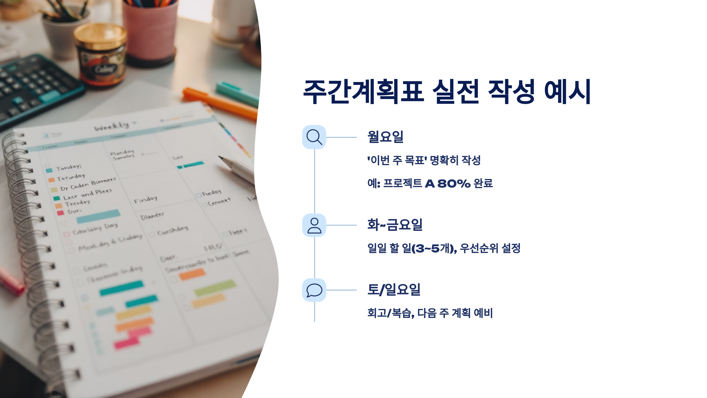 예를 들어, 시험을 준비하는 학생이라면 월~금은 과목별 공부 계획, 주말은 오답노트 정리와 모의고사를 배치하면 좋아요. 직장인은 프로젝트 진행사항과 회의 일정을 분산해 배치하고, 주간 마무리로 보고서 작성시간을 넣는 식이죠. ✍️📌