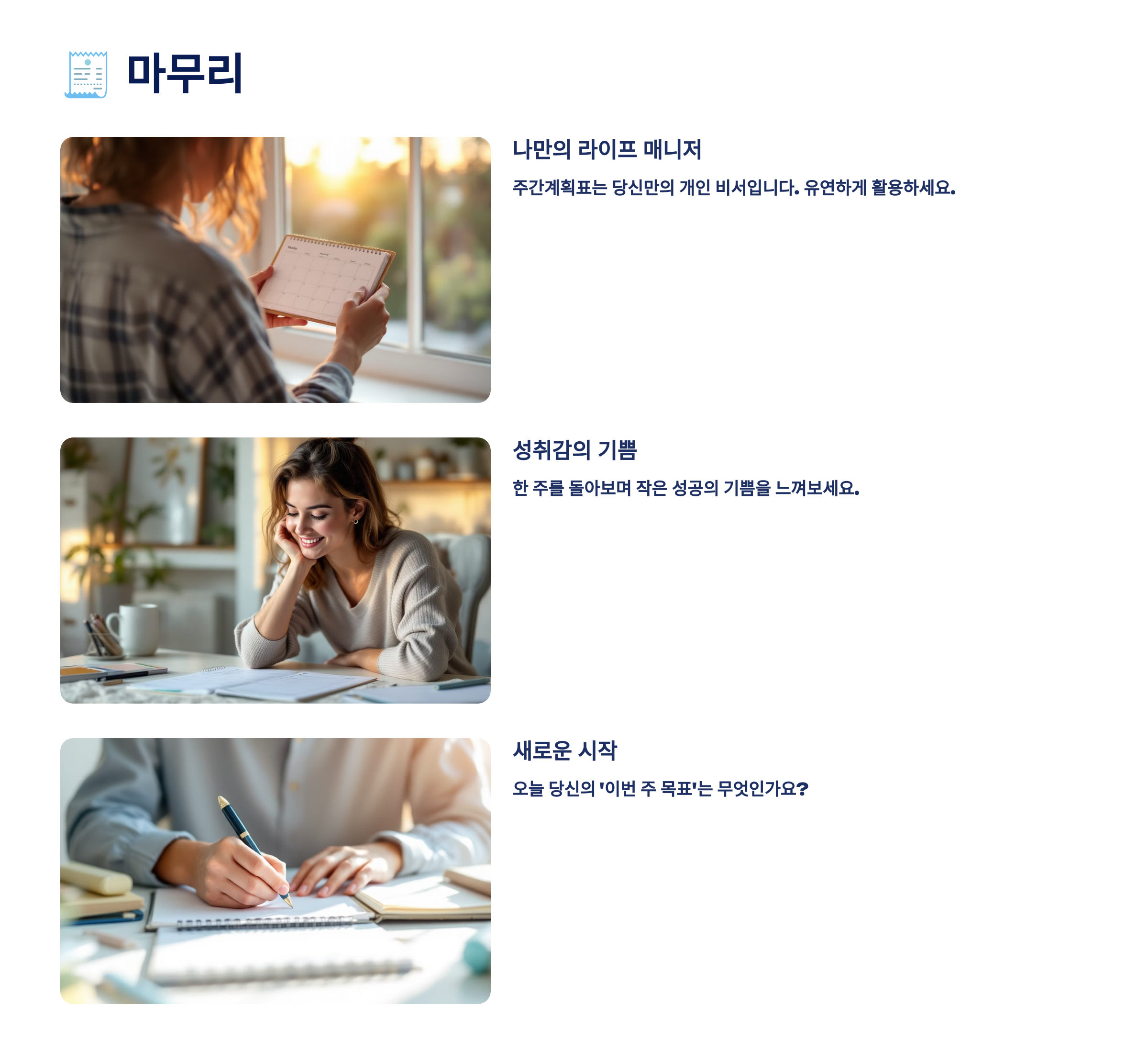 또한 학생, 직장인, 프리랜서 등 누구든 사용할 수 있고, 자기계발, 운동, 공부, 프로젝트 관리 등 어떤 영역에도 활용 가능해요. 일주일의 시작을 정리하면서 삶 전체의 방향까지 조율할 수 있다는 점에서 정말 강력한 도구랍니다. 📘💪