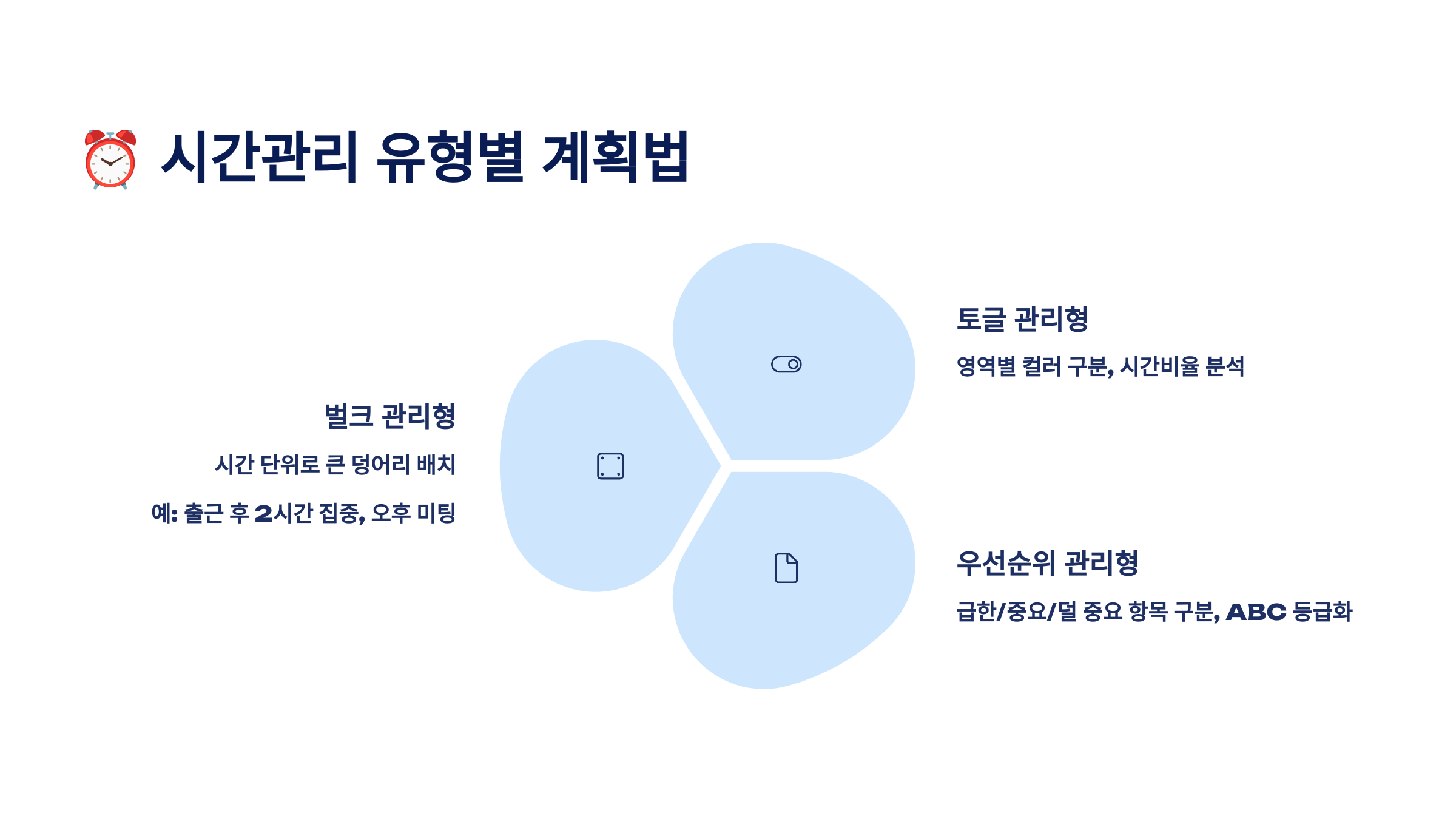 | 구조화형 | 정해진 시간에 따라 움직임 | 시간 블록 계획 | 타임테이블형 |