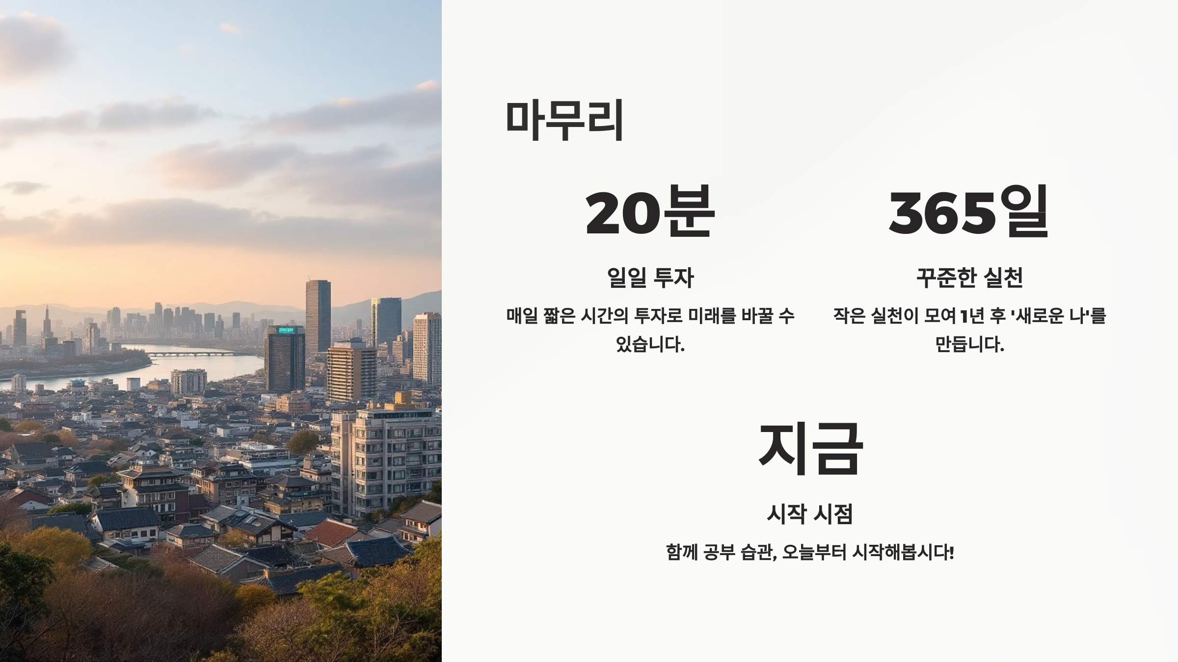 시간이 없는 게 아니에요. 우리가 그 시간을 어떻게 '써왔는가'가 더 중요해요. 퇴근 후 1~2시간을 단지 쉬는 시간으로만 쓰기보다는, 미래의 나에게 투자하는 시간으로 바꿔보세요. 아주 작고 짧게라도 매일 반복하면, 1년 뒤엔 전혀 다른 길 위에 서 있을 수 있어요.