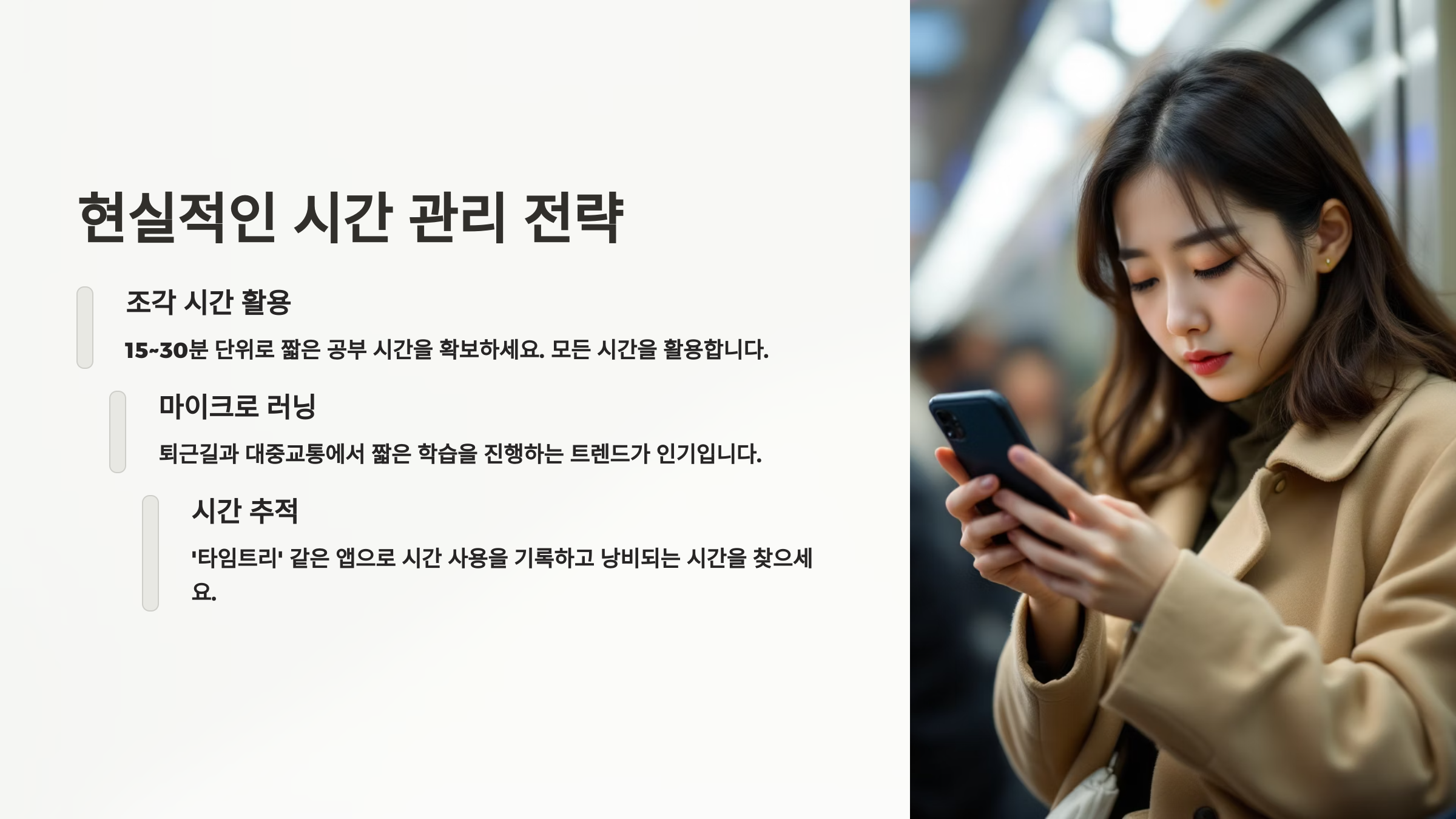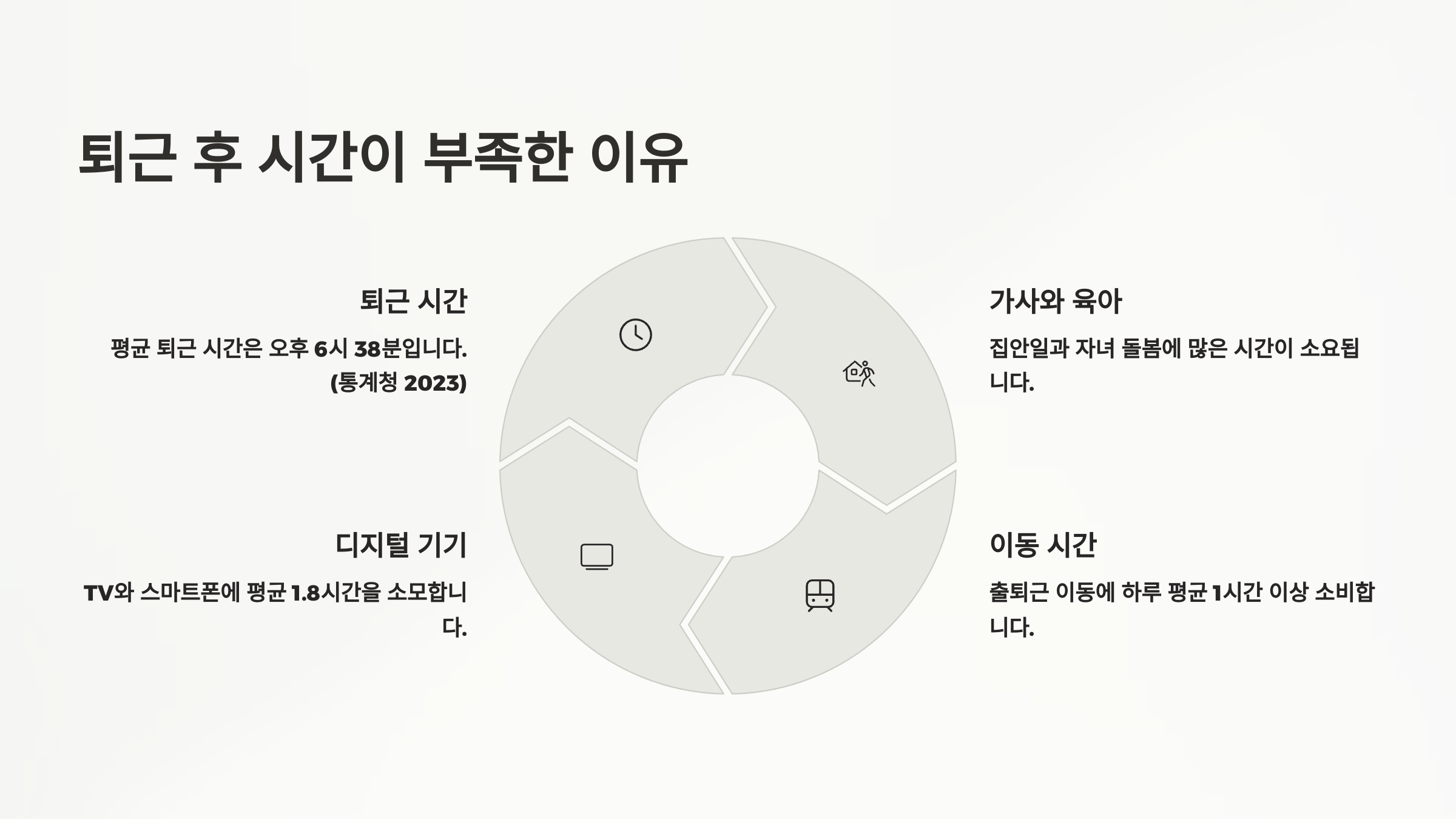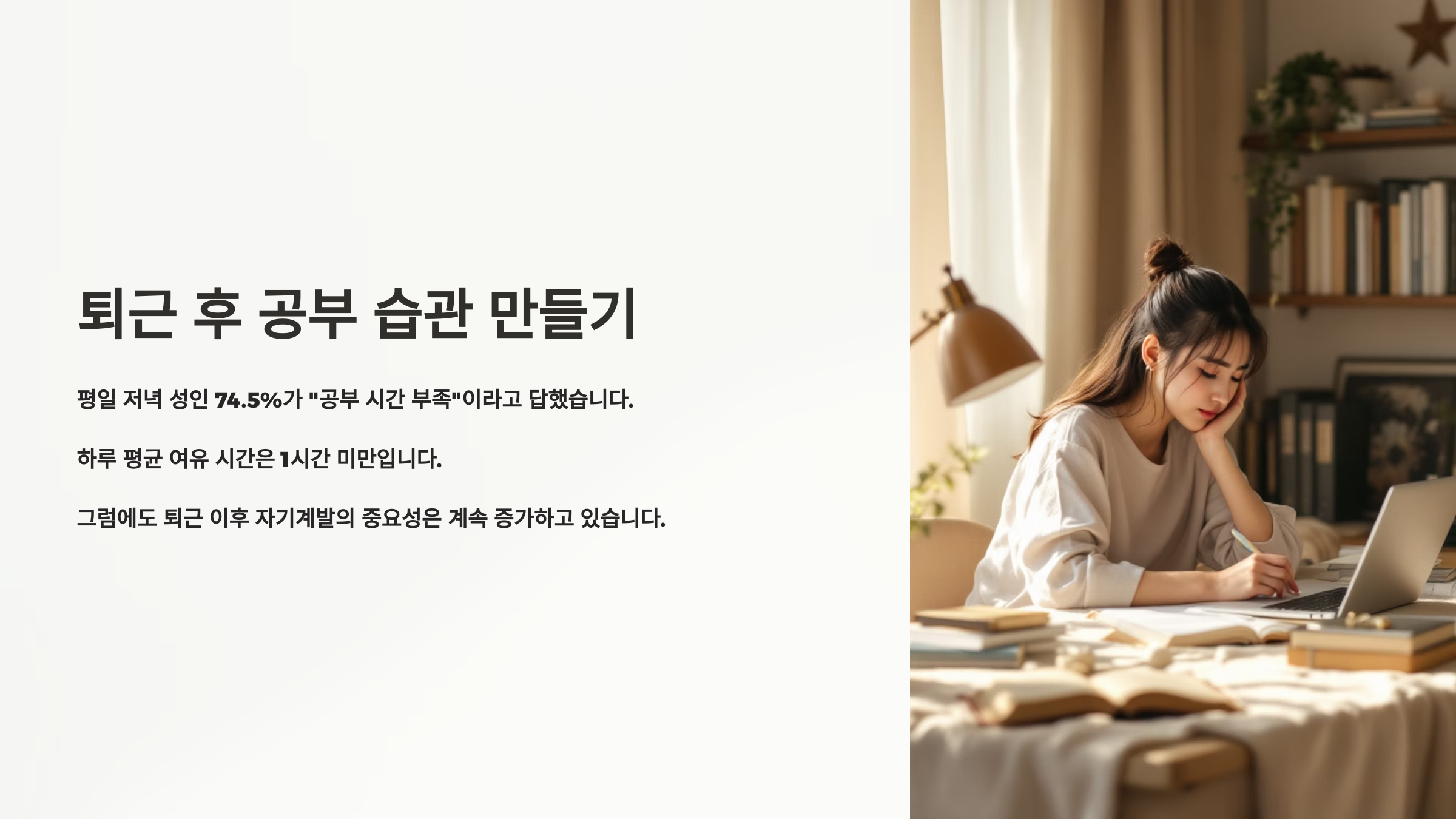 직장인이라면 누구나 공감할 수 있는 고민, 바로 "퇴근 후 시간이 왜 이렇게 짧지?"예요. 아침 일찍 출근해 정신없이 하루를 보내고 나면, 정작 나를 위한 시간은 고작 2~3시간밖에 남지 않죠. 씻고 밥 먹고 조금 쉬다 보면 어느새 자야 할 시간이 되고요. 이 짧은 시간을 공부에 쓴다는 건 결코 쉬운 일이 아니에요.