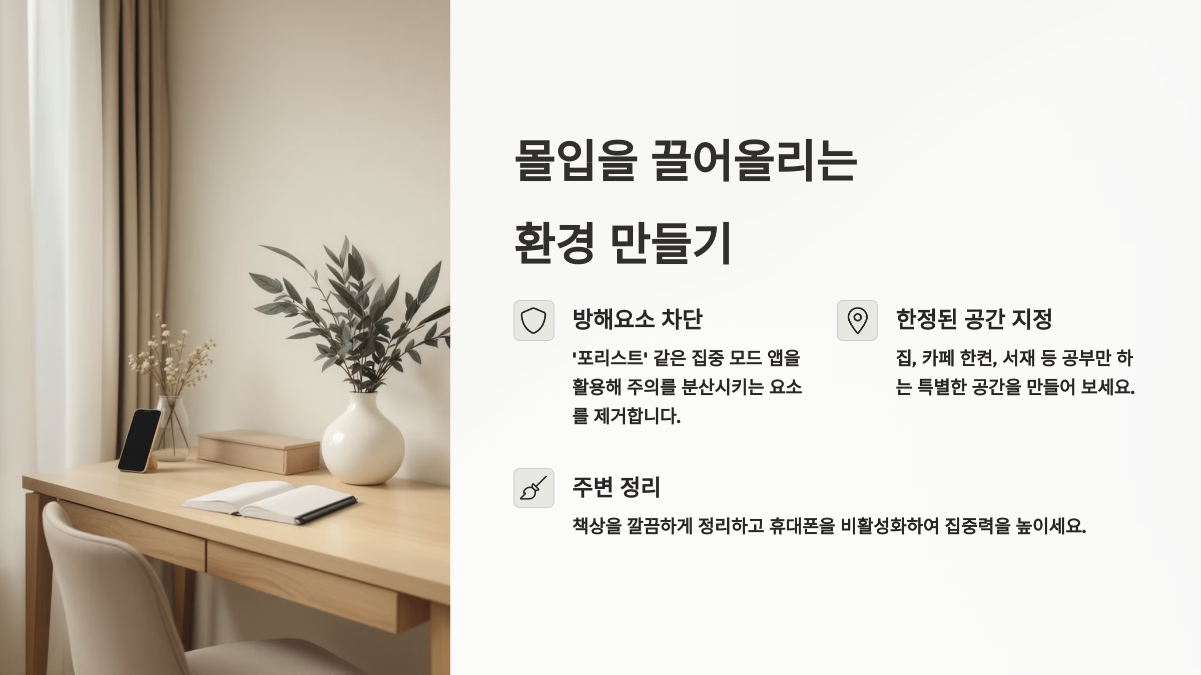 이제 우리는 시간을 어떻게 확보할지 배웠어요. 다음은 이 시간을 더 깊게 집중할 수 있도록 만드는 환경에 대해 이야기해볼게요.