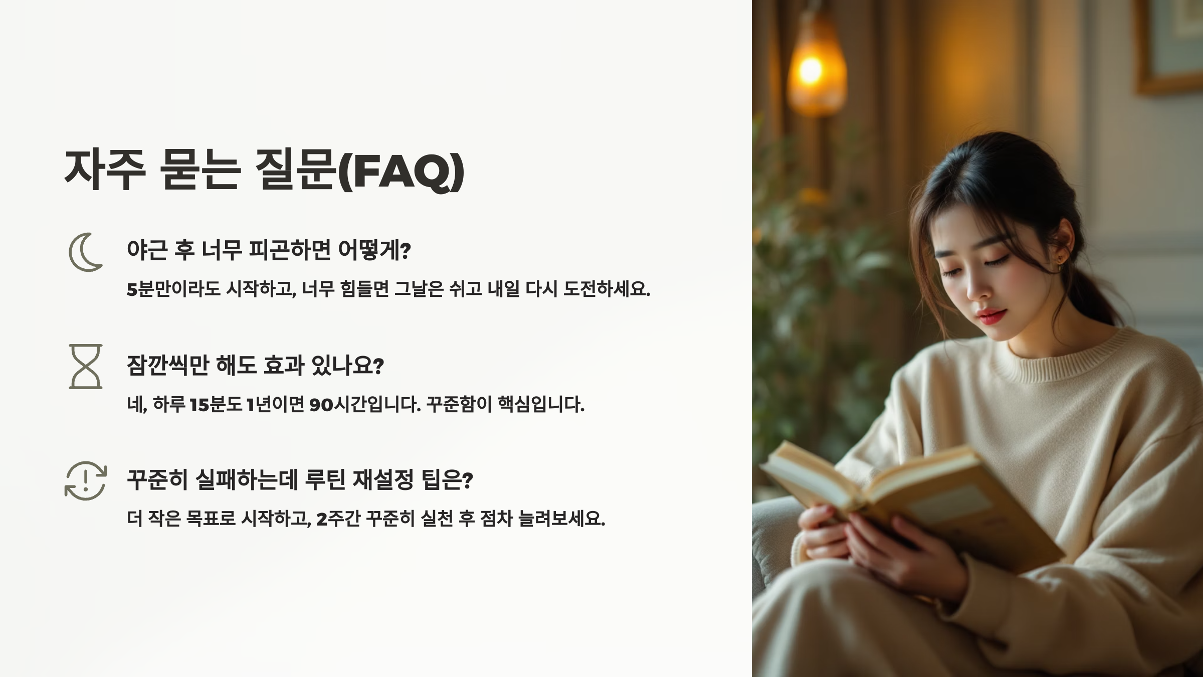 시간 자체는 우리 모두에게 공평해요. 다만, 퇴근 후의 피로감과 유혹, 환경, 변수들이 우리의 계획을 방해하고 있을 뿐이에요. 이걸 인정하는 것부터 시작해야 해요. "왜 나는 못 지킬까?"가 아니라 "왜 지키기 어려울까?"라는 질문을 던져야 해요. 문제를 정확히 알면, 해결 방향도 뚜렷해지니까요.