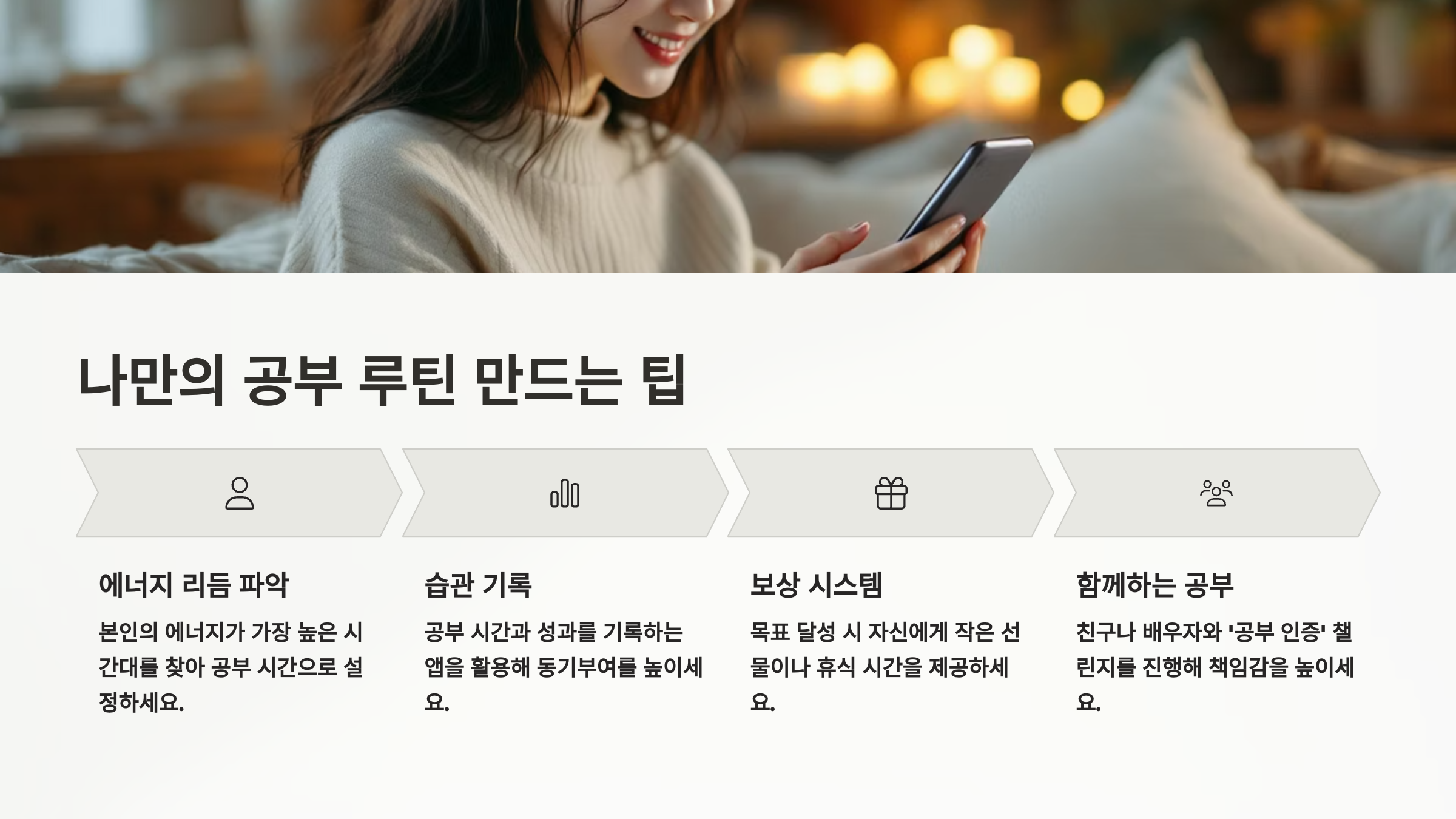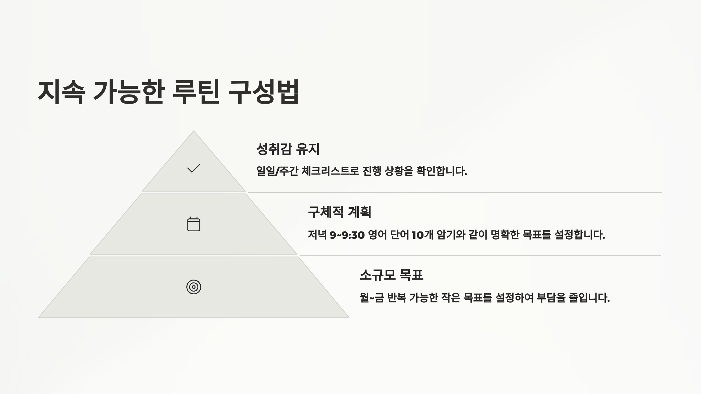 공부를 오래도록 이어가고 싶다면 가장 중요한 건 지속 가능한 루틴을 설계하는 것이에요. 루틴은 단순한 습관의 반복이 아니라, 내가 어떻게 살아갈지를 디자인하는 방식이에요. 단기적인 열정보다는 ‘꾸준함’을 중심에 두고 만들어야 해요.