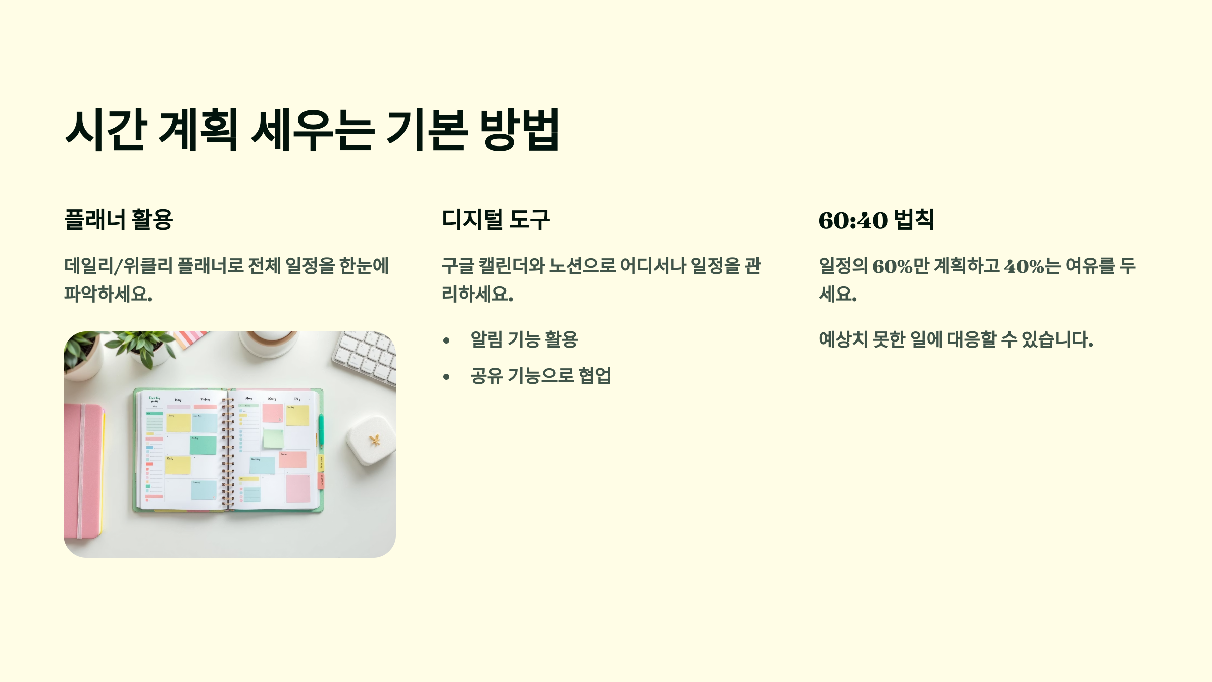 시간을 제대로 관리하려면 단순 계획만 세우지 말고, 실천력을 끌어올리는 전략이 필요해요!