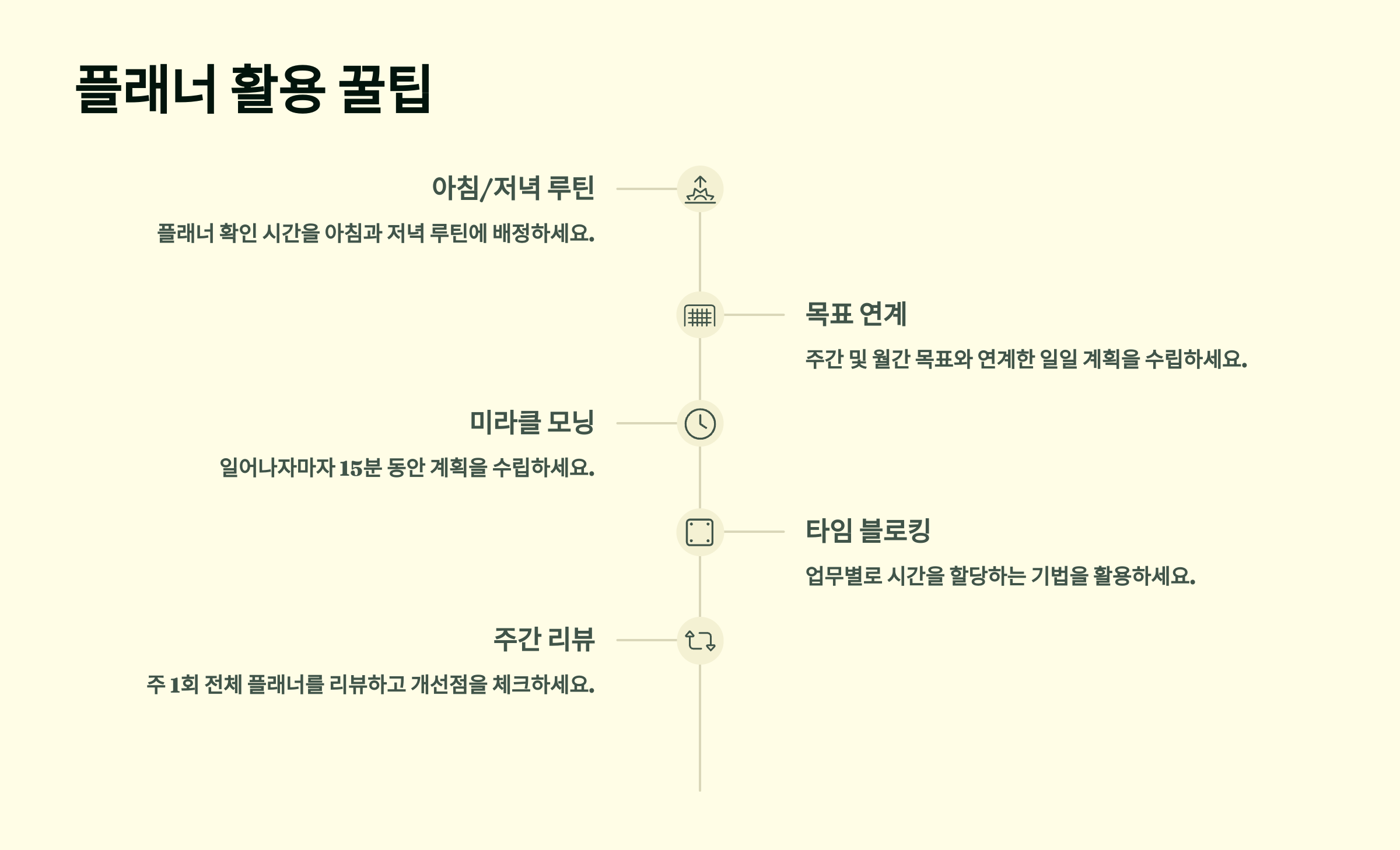 | 루틴화 | 계획 → 실행 → 습관 | 기상 직후/취침 전 시간 고정 |