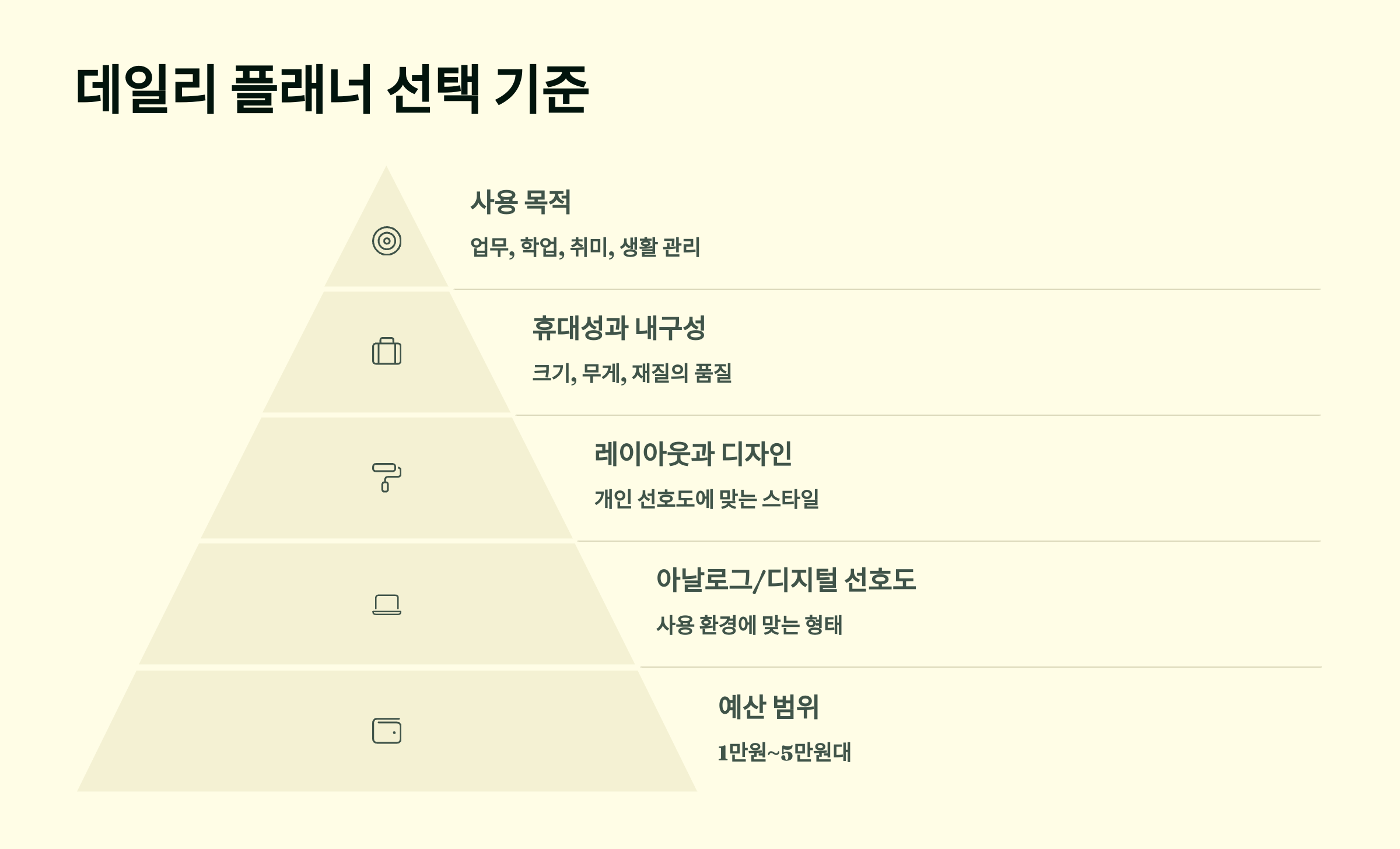 데일리 플래너를 고를 때 가장 먼저 고려할 점은 내가 언제, 어떻게 쓸 것인지에 대한 용도예요. 단순 일정 정리용인지, 감정 기록이나 공부 루틴까지 포함할 것인지에 따라 구성이 달라지거든요. 😊📓