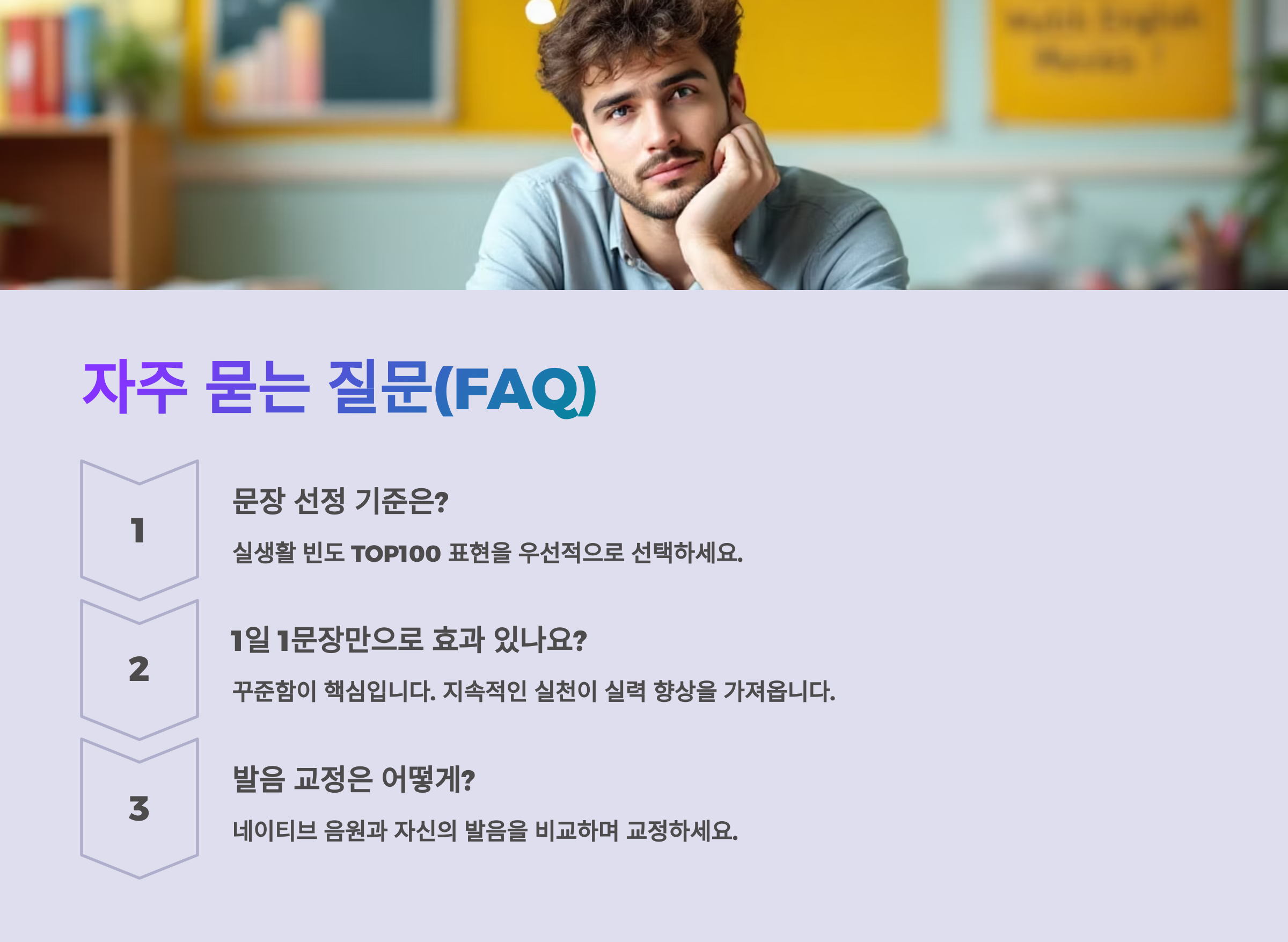 다음 섹션에서는 ❓ FAQ 1일 1문장 영어 학습에서 자주 묻는 질문 8가지를 알려드릴게요! 📬